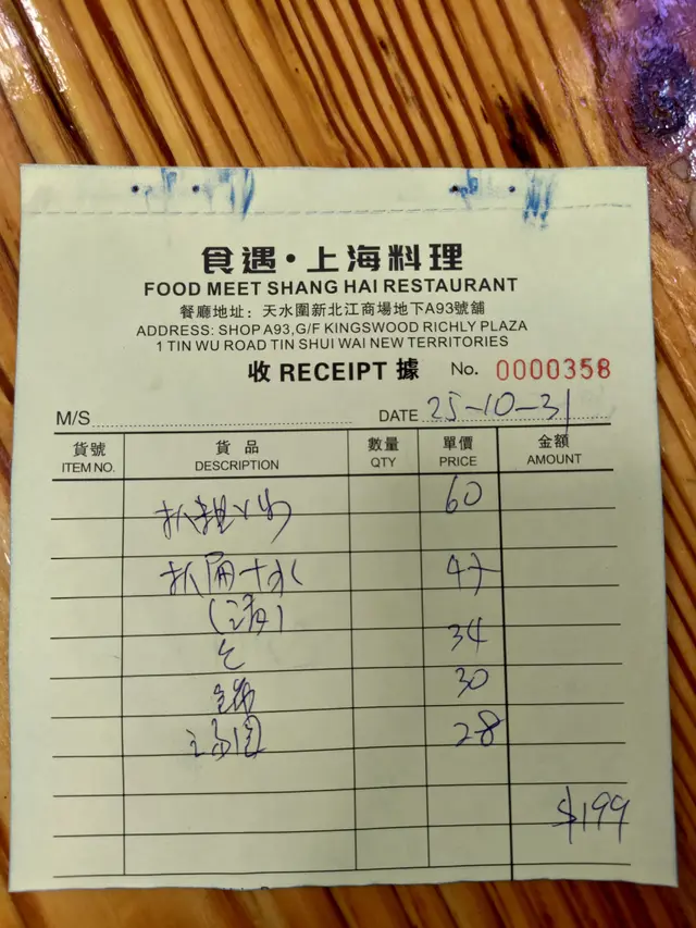 食遇上海料理 (天水圍) 網址: https://s.openrice.com/QrbS0z2A600 地址: 香港天水圍天湖路1號嘉湖新北江商場地下A93號舖 電話: +852 95894878