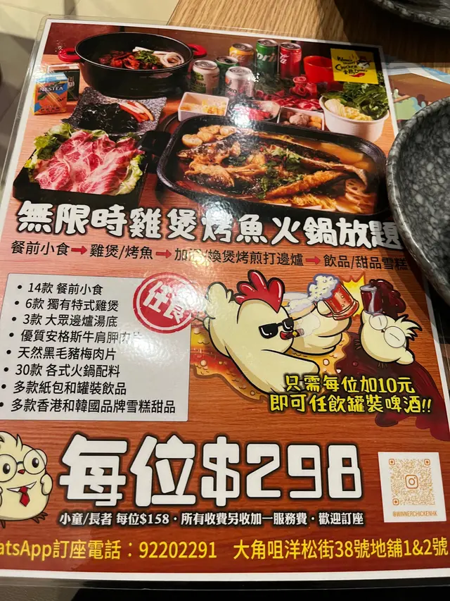 7點半入座,到9點都係食得兩輪雞煲。聲稱10分鐘就有一輪,實際上係半個鐘都無一輪。12點收工,9點未到已經無曬菜,炸雲吞又賣曬,咩都無。火鍋食品食曬都無,痴線舖頭。完全唔夠人做又開咁多張台,仲298一位+1。極度不建議😖😖😖老實講,d雞係唔錯嘅,但係半個鐘先一煲係咩事,應承10分鐘出到,實際上就超過半個鐘。又唔俾人提前嗌定嘢,唔知想點,怪唔知無限時間任食啦,六點食到12點應該都食到兩三煲嘅😖😖😖…查看更多
