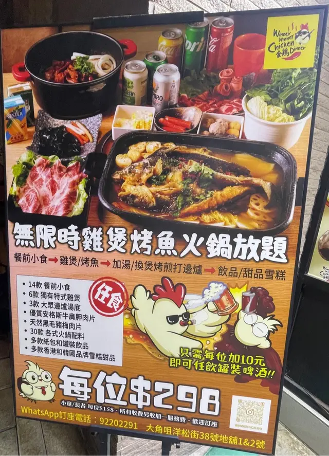 食雞 winner winner chicken dinner 店鋪好似漆黑中既螢火蟲鋪面banner黑超雞一隻非常去到店內店員好友善好客介紹欣勤 突開始轉涼既天氣正適合黎一場火鍋邊爐放題店內主推七款不同口味雞煲 睇落每一款都幾吸引 有椰香雞煲 泰式雞煲 養生正氣雞煲 睇落都各有風味 最後起店員推介下選擇左招牌雞煲 黎到都幾多雞件下 啖啖肉 食落味道都幾惹味 食完一鍋後因為都幾多雞肉下 我地就開始左打邊爐 有基本既火鍋配料可以選擇 有牛豬肉片 叫左個日式關西湯底 同一啲安格斯牛肩胛片同埋黑毛豬梅肉 都幾有肉味濃厚 質素正路 配搭埋一啲豆腐 蔬菜烏冬 同丸類當中幾欣賞佢有個超長既蟹柳 …查看更多