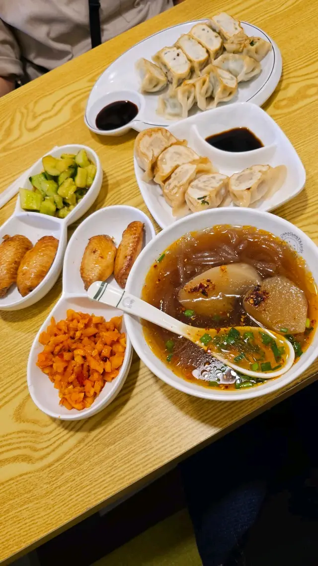 其實餃子真係好好味呀!今次路過發現呢間餃子小店,有多種唔同口味餃子選擇,除左餃子仲有小食,套餐價都幾抵食,全日套餐只係$58,已經包括左餃子、麵、2款小食同飲品!我地就分別叫左湯餃同埋煎餃!湯餃有蕃茄湯同埋關東煮湯選擇,蕃茄湯配餃子唔錯,酸酸甜甜好開胃,餃子粒粒飽滿,皮薄餡靚!要特別一特既係孜然羊肉餃,孜然味好香,羊肉又唔會有勁大羊騷味,配合得啱啱好小食有鵪鶉蛋、雞翼、中華沙律、豬耳等等!鍾意食野多選擇既我表示好滿意而飲品有自家製豆漿同楊梅青檸飲!豆漿味道濃郁,又唔會太甜青檸飲酸酸地夠哂解渴呀查看更多