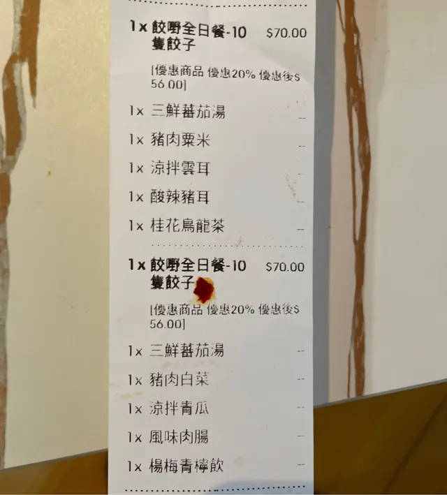 呢日是但入一間餐廳食見佢$40有下午茶就試下點知伏到喊叫咗一個下午茶餐跟小食B list($40)要咗白菜豬肉蒸餃+蒜香雞翼蒸餃一睇就知皮厚而且蒸出嚟啲皮冇油亮既感覺餡料偏少雞翼方面,我男人形容為中學小食部雞翼味另外男人叫咗一個全日餐$58多咗一個麵、同一款小食佢要咗豬肉韮菜餃加咗$5要煎餃同樣地都係麻麻地一隻靚餃應該由皮會透出綠色既韮菜但呢隻餃就睇唔到而且咬開發現有啲韮菜已經變黃烏冬都係街市最平個款烏冬所有嘢好似都冇咩誠意最不能接受既係豆漿變壞飲咗一啖覺得有怪味就要求換過枝侍應先話換番一枝今朝新整既豆漿俾我哋變壞咗呢枝有可能係琴晚既...唔好味都算但變壞就真係搞唔掂查看更多
