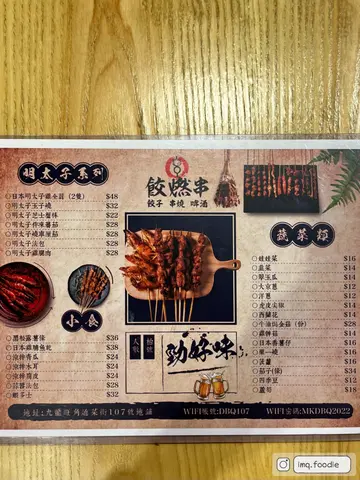 餃燃串 (旺角) 網址: https://s.openrice.com/QrbS0ARSB00 地址: 香港旺角通菜街107號地舖 電話: +852 55199813