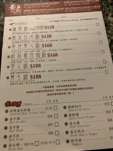 前幾天我約了兩個朋友去吃飯,地點我們選擇了在佐敦的養心殿,因為那天他們都是放假,所以我們決定要在七點前離座可以享有半價優惠。我們叫了一個鴛鴦鍋,左邊白色的是養生鍋,而右邊深色的就是美人鍋,看得出材料很充足。我們先每人喝了一碗湯,我喝了養生鍋,就是白色的。味道很重藥材的香味,感覺很養生又健康。另外我們還叫了一些打邊爐的材料,好像手切牛肉,老油條,魚蛋及鮮蝦滑等等...老油條就是我們所說的油炸鬼,吸收了湯底的精華,而且又脆又柔軟。這是手切牛肉,這裏的食材都很新鮮,可以看得出牛肉是鮮紅色的,而且脂肪分布得很好、很平均。味道柔軟又軟熟。這是魚蛋及鮮蝦滑,魚蛋很爽口,而鮮蝦滑味道鮮味,又帶點咬口。另外還送了每人一杯青檸沙冰,味道酸甜而且冰凍,真是令人透心涼!…查看更多