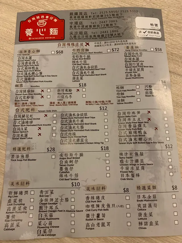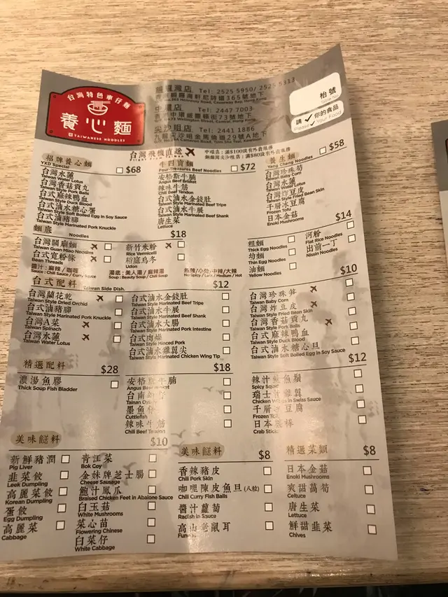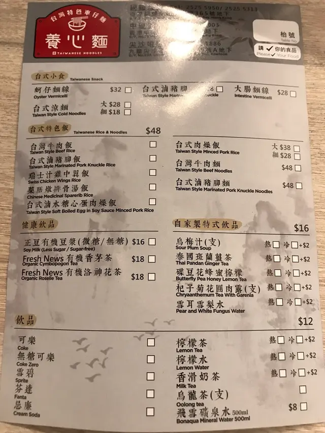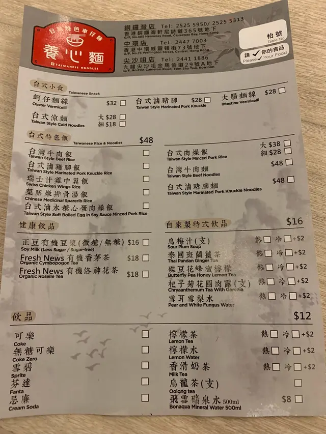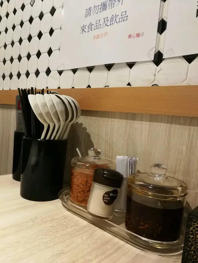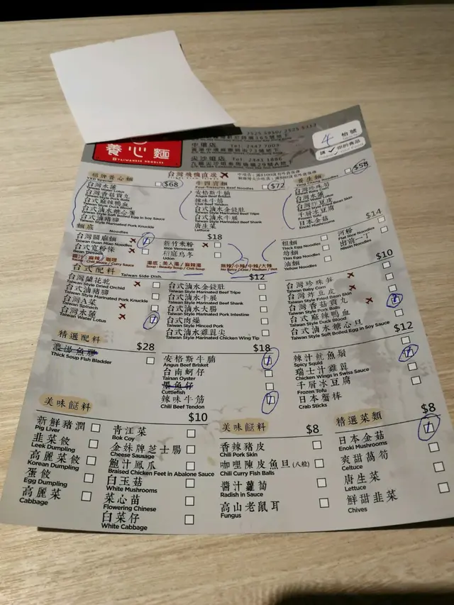 養心麵既賣點係車仔麵 湯底亦有養心殿最出名既美人湯及麻辣湯可選 好辣既我當然就揀左麻辣湯啦 不過因怕太辣就只嗌左小辣 結果唔夠辣 好彩檯面亦有辣油任加 同樣夠香夠辣 建議食得辣既朋友可以直接挑戰中辣或以上菜單上見到有數種食材都係台灣直送 亦有台式肉燥飯 小食及飲品 但我則嗌了碗車仔麵及一枝杞子菊花圓肉露 落單後先付錢後上菜我無嗌套餐麵 根據自己口味 選了關廟麵配牛筋 牛腩 金茹 水蓮 瑞士雞翼 鴨血六個餸 全部都係吸汁既重口味食物