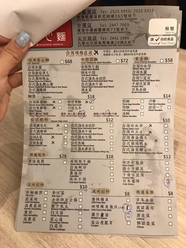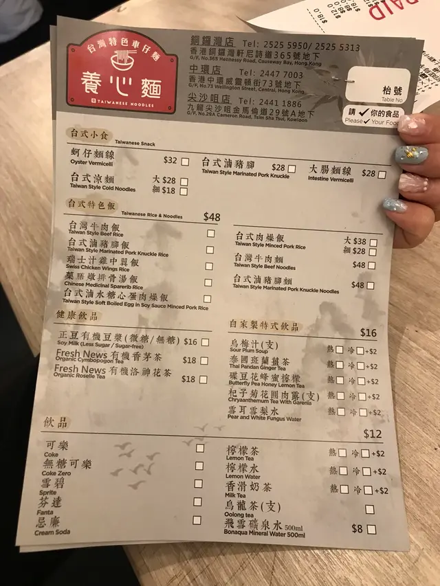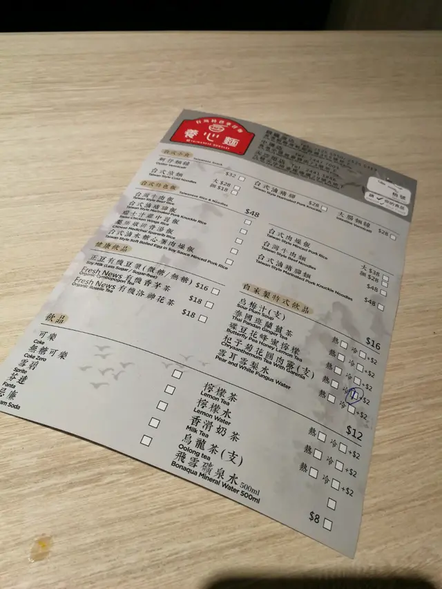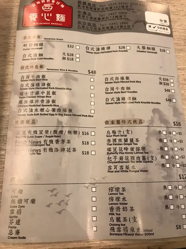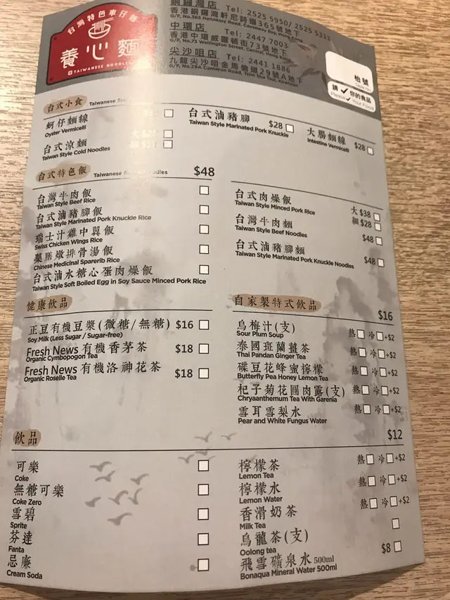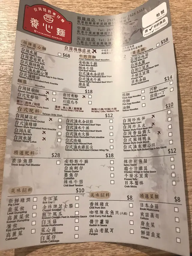 養心麵既賣點係車仔麵 湯底亦有養心殿最出名既美人湯及麻辣湯可選 好辣既我當然就揀左麻辣湯啦 不過因怕太辣就只嗌左小辣 結果唔夠辣 好彩檯面亦有辣油任加 同樣夠香夠辣 建議食得辣既朋友可以直接挑戰中辣或以上菜單上見到有數種食材都係台灣直送 亦有台式肉燥飯 小食及飲品 但我則嗌了碗車仔麵及一枝杞子菊花圓肉露 落單後先付錢後上菜我無嗌套餐麵 根據自己口味 選了關廟麵配牛筋 牛腩 金茹 水蓮 瑞士雞翼 鴨血六個餸 全部都係吸汁既重口味食物