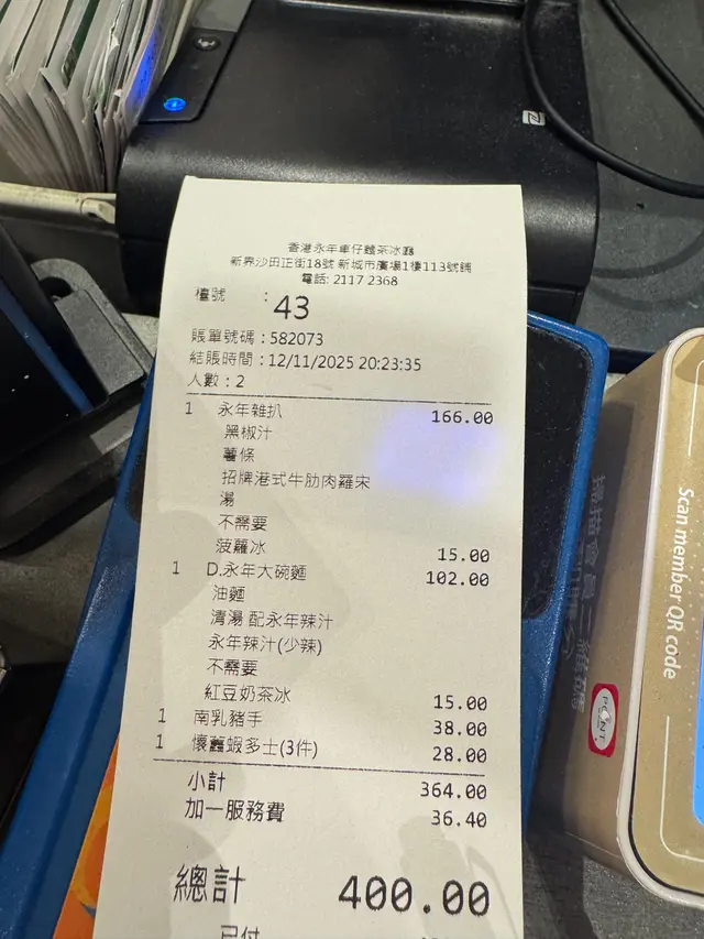 香港永年車仔麵茶冰廳 (沙田) 網址: https://s.openrice.com/QrbS0HzE4W0 地址: 香港沙田沙田正街18-19號新城市廣場一期1樓113號舖 電話: +852 21172368