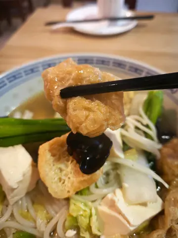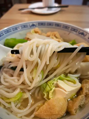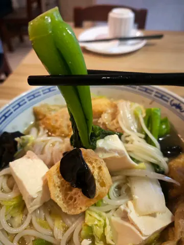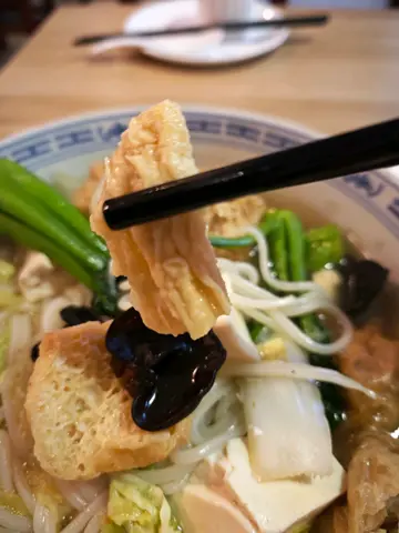 今日又想食素😅, 不過唔想食飯, 都清淡d, 都係揀左六餸米線, 今日都幾多客人, 而且以熟客為主, 等左一陣入面廚房工作的姐姐送出來😁, 用藍色大碗, 依d款式的碗通常只有屋企才會見到, 即刻覺得好有屋企feel😆, 賣相唔錯, 不過同上次食有d唔同, 或者六餸係無規定, 有廚房隨意配搭😋飲啖湯先, 有甜味, 覺得清甜😅👍之後看到有豆卜枝竹菜心娃娃菜雲耳生根豆腐, 夾開d餸望下米線, 都比得唔少, 夾來食下先😄居然唔係淋似外面食店個只, 係有d QQ爽彈👍唔係煮唔熟, 依只米線好好食💯食下其他素菜, 雖然唔係d乜嘢, 不過浸左湯食落又幾ok😋👍 55蚊抵食, 始終係傳統素食店, 地方又不大, 就唔可以要求有乜嘢裝修同服務, 但確實食到一份人情味, 見到他們也忙住pack飯盒為派飯作準備😍🥰…查看更多