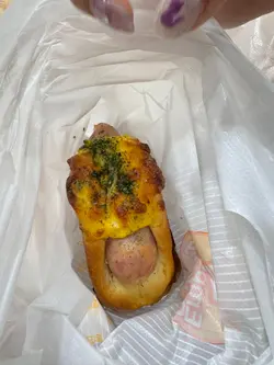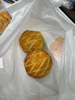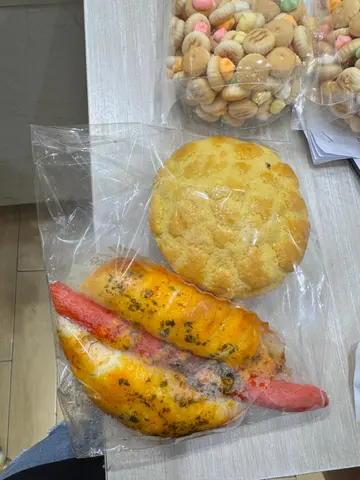 一早開門嘅早餐麵包舖,為於粉嶺火車站附近,由出口一行入粉嶺名都商場,已見到麵包店嘅存在。舖面似舊式麵包店,但似乎較擅長焗皮嘅麵包,牛角包、丹麥條等,亦有一啲夾餡嘅包,例如忌廉包等,門外仲有三文治賣。趕住返工,無再仔細查看。蒜蓉肉鬆包$10外型超大,大概係一部IPhone 8 Plus嘅大細。個包鬆軟,但因為夠大個,朝早8點食完,到中午都唔會肚餓👍🏽作為箍牙妹,最like佢唔似其他肉鬆包會硬到成個法包咁,雖然有肉鬆嘅位置依然會硬啲,但起碼唔會咬到牙痛😬