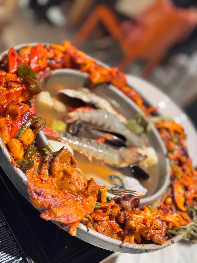 今次去馬場洞烤肉專門店唔係食烤肉‼️係食新出既🔥火焰牛油海鮮3+1鍋🫕3+1係邊四樣野呢👇🏻👇🏻👇🏻1️⃣ 熱炒小章魚及五花肉2️⃣ 熱炒豬皮及豬腸3️⃣ 香辣無骨雞腳及辣炒雞肉4️⃣ 酒煮牛油海鮮鍋上枱個陣好似睇表演咁,店員先倒入燒酒,再點火,火焰先燒燒海鮮🔥過程好打卡🤣🔥鍋內嘅海鮮,分別有蠔、大蝦、青口、蜆,火焰燒完之後再倒入高湯,然後一路滾下滾吓,食到最後個湯可以飲架,好鮮甜🥰鍋嘅周圍分別擺咗代表海陸空元素嘅小章魚、五花肉、炒豬皮、豬腸、無骨雞腳、辣炒雞肉🐥味都唔算太辣,食得過癮,個人最鍾意食豬皮,口感好Q彈,無骨雞腳都好食,充滿骨膠原😚😚🔸海鮮辣炒碼麵另外都叫咗個主食,呢個係韓式中華料理品牌「恭合春」製作嘅海鮮辣炒碼麵,麵條好有咬口,配料豐富,湯底微辣,叫一碗share都唔錯。🔸戀上雪花冰(草莓味)最後仲食咗新出嘅甜品,係草莓味嘅牛奶雪花冰,草莓醬同牛奶,簡直係Perfect match,甜甜酸酸一解食韓國嘢嘅辣🤣📍#馬場洞烤肉專門店 (#K11購物藝術館) (#尖沙咀美食)#尖沙咀 河內道18號K11購物藝術館1樓107號舖The Jang