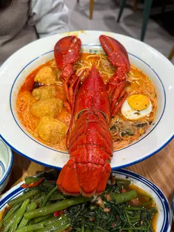 龍蝦喇沙大爆發 HKD98,龍蝦非常大隻,龍蝦肉不錯,切開有不少龍膏在內。喝一口喇沙湯,鮮味無比,又帶點辣,配上摻摻麵,完全可以吃到湯底惹味。以優惠價可以享用大大隻龍蝦和大大碗麵,配上喇沙湯底,不能不吃的美食。