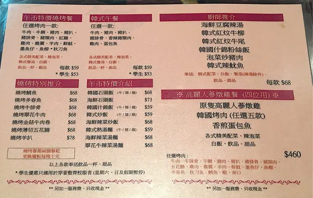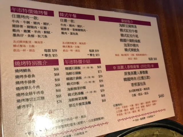 夜晚6:30去到,已經開始有食客已經食緊。可能疫情關係,自助放題取消左,得返套餐 or 散叫。套餐有一人餐(110蚊/170蚊),二人餐(288蚊起),四人餐。我影底左個餐牌,有興趣可以自己click 黎睇。我地3個人,叫左4個110蚊餐。有牛肉,羊肉,五花腩(都厚身),牛脷。1人套餐包,前菜(包3小碟),湯,飯,肉,甜品(係一片橙黎)注意:茶係免費任refill. 如果前菜唔夠,可以比錢單點購買。不貴,都係12蚊碟食熱氣野,無理由唔叫凍飲既 叫左38蚊Jar 菊花蜜飲。夜晚套餐碟肉比下午大一倍。可能係週末,都多人黎食,7點幾已經好旺,所以最好記得訂位。我一直都有幫襯呢間餐廳,因為呢度韓燒價位真心佛心價,出面食韓燒,下下一碟肉都2,3百蚊了。喺呢度食多2碟,都仲得。 .我覺得牛脷,五花腩,羊肉都好食,反而牛肉就較普通。d 職員姐姐同哥哥幾忙都好,都保持禮貌。 希望呢間鋪,可以捱得住啦查看更多