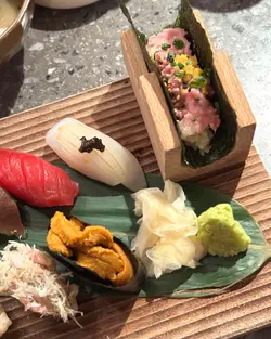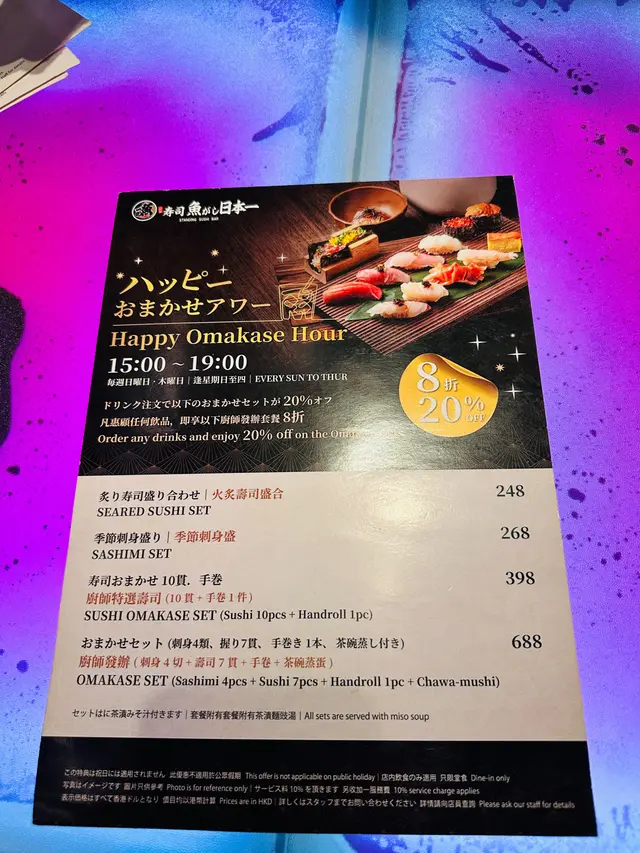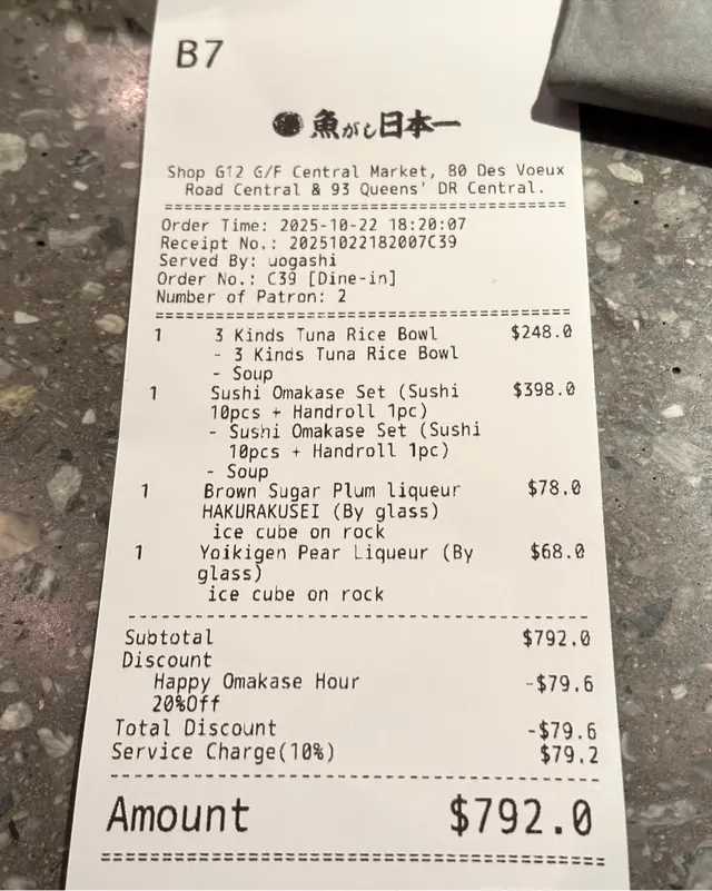 魚がし日本一,位於活化後嘅中環街市,主打日式料理料理吧枱別具特色,配上現代化的日式佈置旁邊仲有酒櫃,放有酒精飲品、清酒等是中環街市中享受日式美食美酒的好選擇🍶🍣廚師特選壽司十貫壽司加上手卷,手工精緻、用料新鮮金目鯛、油甘魚、池魚、真鯛、吞拿魚魷魚、赤蝦、帆立貝、蟹肉蟹膏、海膽🍣蔥吞拿魚蓉手卷,以日式木架盛載綿密的吞拿魚蓉直擊味蕾,鮮味充滿口腔🐟金目鯛肉質柔軟而鮮味🐟拖羅入口即融,爆發油脂感與鮮味🍤赤蝦口感軟綿,鮮甜濃郁🦑魷魚滑溜而煙韌,口感細膩,令人驚喜🦀蟹肉蟹膏味道香濃,帶絲絲蟹肉口感壽司以黑松露、柚子胡椒等調味點綴,味道層次更為豐富🍱海鰻魚丼🐍炙燒穴子海鰻,表面帶點炙燒焦香,底部依然細嫩搭上絲絲紫菜與片片菊花花瓣,口感清澈淡雅玉子燒蛋味滿滿,食落厚實有層次🍲茶漬麵豉湯麵豉味道濃厚,帶有點點芝麻風味 令人意想不到碗中竟有鯛魚片,入口鮮味軟滑🐟底部還有泡飯,鯛魚片與泡飯配襯出麵豉湯的味美🍸Suntory 蜂蜜蘋果酒🍎入口順滑不太刺激令人享受的蘋果風味之間帶有蜂蜜餘韻🍯伴隨微微的酒精感,令人陶醉🍹水蜜桃乳酸水蜜桃搭上乳酸,味道甜美而清新入口氣泡感十足,在夏日中帶來清涼感覺總結而言,魚がし日本一用料新鮮,料理方式出眾,酒類繁多是一間高質而值得一試的日式料理😋…查看更多