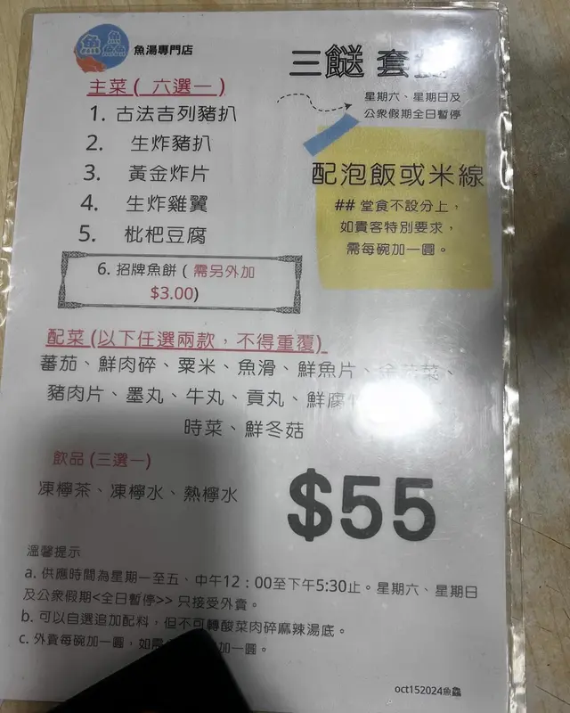 今次嚟到荃灣 試下喱間主打鮮魚靚湯嘅小店 不過感覺實在太差 六點零坐低唔算多人 雖然店員講咗背包可以掛頭頂 但眼見全場勁多吉位 咪諗住拉張吉椅放低 有人嚟我自然識趣拎返啦 但店員好似好唔滿意 堅持背包不能放椅子 這是小店的執著 仲見到原來温馨提示咗大家 貼好咗標貼在牆身 其實無問題嘅 你有你執著 但有好多吉位時 你嘅執著咪令人覺得你唔識做 好老套囉 相信小店主打街坊生意 你識做我識做 有人入嚟唔通我仲死霸張椅嚟放嘢咩 無必要咁樣要求客人堅持你嘅執著呀 講緊嘅係客人觀感我哋將抹手後啲濕紙巾放喺枱面 店員好無禮貌又好不屑問 你哋架? 然後收起 個樣勁不滿咁 嗌完嘢食 用力劈低張單喺枱面 都唔知發生咩事 感覺極差 聽到佢對其他客人都係粗魯拋低食咩呀 好似前世欠你咁嘅態度 講完服務 講食物質素 我滿心期待佢哋嘅湯底係濃郁魚味 但一食已經覺得啲湯好似係魚湯溝咗大量清水溝淡咁 好聽係清清淡淡 難聽係溝稀咗嘅湯底 米線尚可 軟硬適中 我哋揀咗炸魚餅同枇杷豆腐米線各一碗 炸魚餅唔錯嘅 有魚肉味 將魚肉剁碎壓餅炸 比較薄身 但口感唔錯 少少彈牙 枇杷豆腐就差啲 肉質好散又唔嫩滑 魚肉味豆腐味欠奉 唔知食緊咩咁我哋另外再加咗個炸魚片 以為係平時食開嘅魚片 點知佢係好似炸蝦餅質地嘅炸魚片 估佢唔到 但佢質地又未做到好似蝦片咁脆 佢中間咬落去係好似受潮咗嘅薯片質感咁 至於味道係有啲魚味嘅 但唔叫好味仲有加多碟全走菜 揀咗菜心 係勁粗壯嘅 煮淋到完全唔想食落去 我個人口味鍾意食較生較硬嘅菜 但佢完全係唔駛用牙咬都得嘅淋度凍飲或可樂要另外加9蚊 如果佢魚湯係真材實料又香濃都叫值喱個價 但咁嘅質素收50蚊就真係不值 整體而言 喱間小店質素低下 主打魚湯無味 魚肉製品亦未見出色 環境唔算狹窄 一張大圓枱 相信係容納唔同搭枱客嘅設計嚟 舒服唔稱得上 但喺小店嚟講算闊落 不過間鋪咁嘅趕客服務態度真係唔知點吸回頭客或令人想幫襯 不過我理解 有機會啲人係食情懷 可能係街坊生意 但喱種情懷係咪應該加多幾分禮貌會令人更加珍惜呢 公道地說 係其中一個唔知係咪老闆娘嘅態度最差 亦有有禮嘅店員在場嘅 講真 香港服務質素低下係眾所周知 如果今時今日仲有街坊幫襯捱得住 唔係要珍惜有禮一點對待客人嗎 食物已經無質素 加埋咁嘅待客之道 真係無語 …查看更多