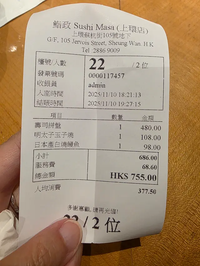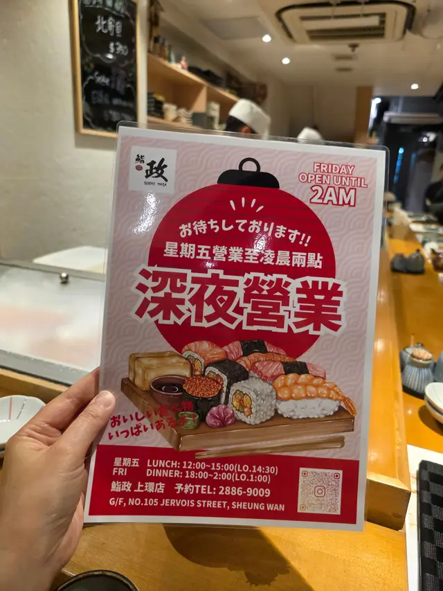 鮨政 (上環) 網址: https://s.openrice.com/QrbS0XYu800 地址: 香港上環蘇杭街105號地舖 電話: +852 28869009