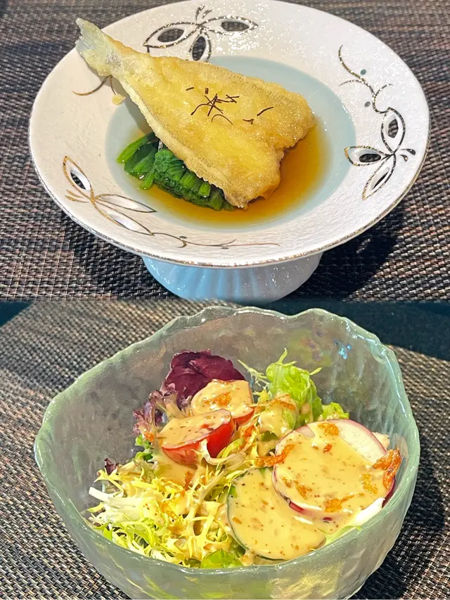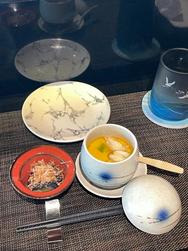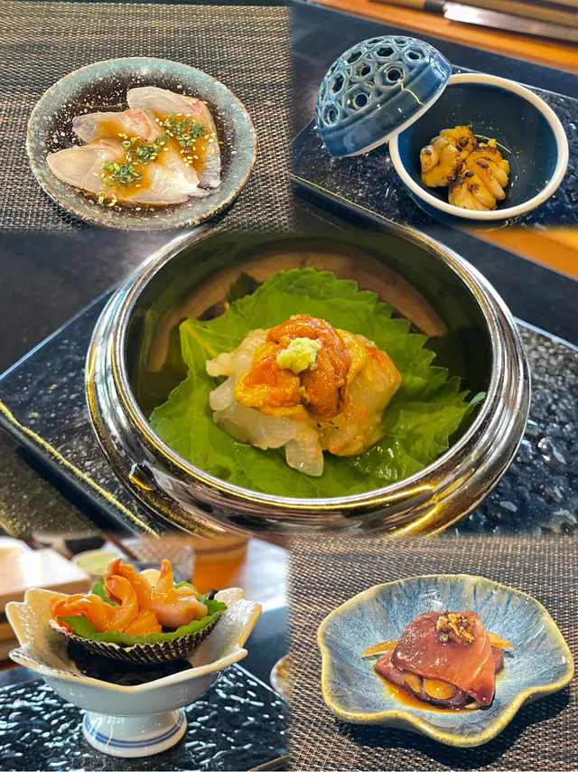 鯖魚 & 油封煮 & 白見貝 & 銀鱈魚 & 岩手縣紫海膽 & 蟹膏鮑魚 & 和歌山香魚 & 大拖羅 & 白舞茸清湯 & 柚子雪葩