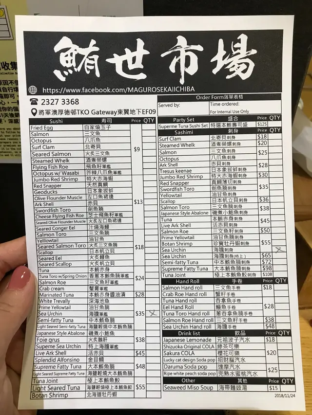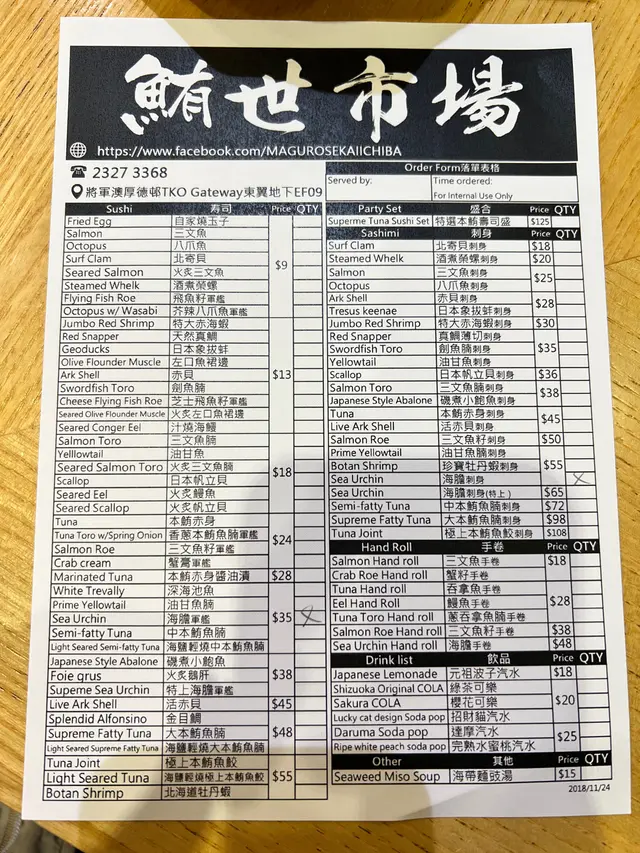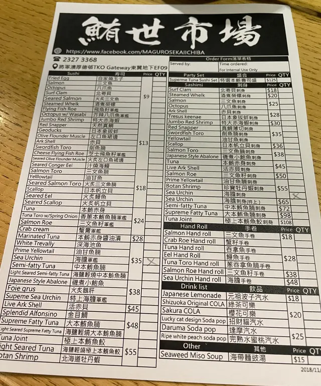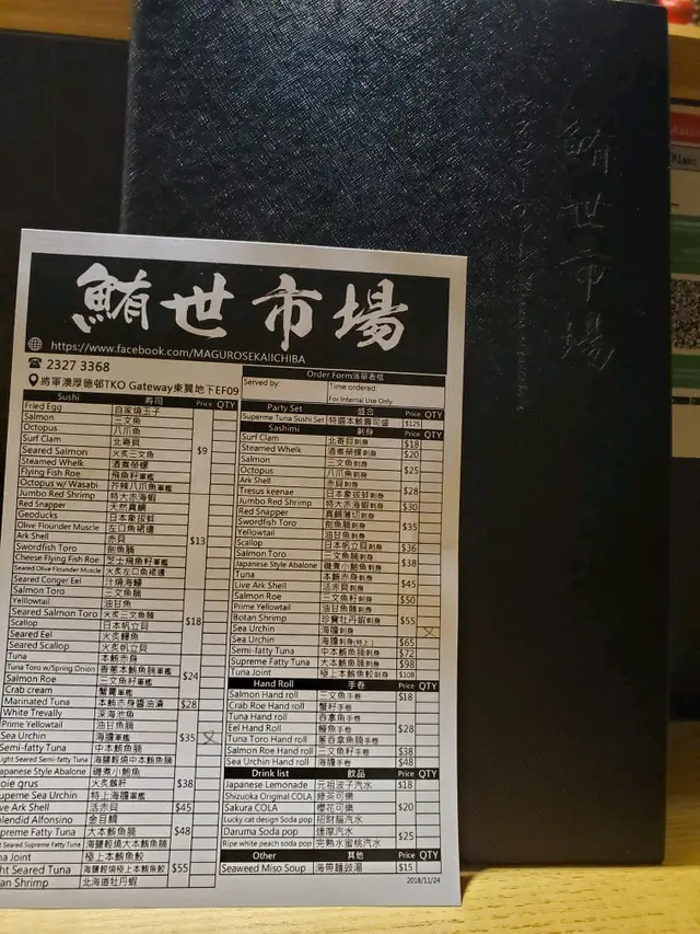 去坑口做完野,順便去TKO Gateway揾野食,近街市隔離有個foodcourt,見到有間好细間叫鮪世市場,剛見5:00幾應該過咗落埸時間,見開了閘又開燈,見開始營業時間又冇人等,就入咗去試,高吧枱可容納4~5人。好彩坐低咗,之後好快已經有食客到😄 好快已經坐滿客人。點餐紙都多選擇,點了 芥辣八爪魚軍艦、 火焰左口魚裙邊壽司、 油甘魚壽司、 特大赤海蝦壽司、 藍鰭吞拿魚壽司、 特上海膽軍艦、 葱吞拿魚腩手卷哩間壽司小店有驚喜喎,食材新鮮,刺身好鮮甜同埋有厚度😋海膽超级鮮甜唔會有腥味🤤溫馨提示:留意哩度有落場時間架,座位真係好少,所以多數做外賣,想坐低食就留意吓喇查看更多