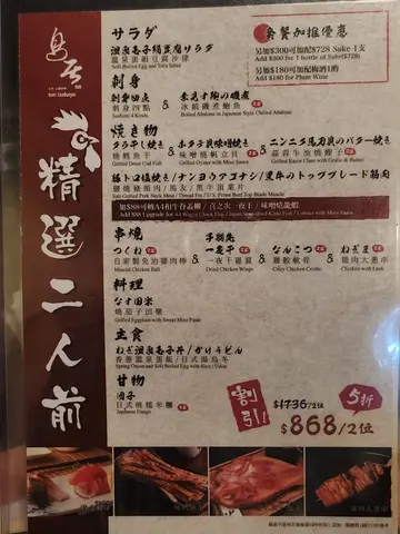 同朋友嚟到銅鑼灣逛街,搵地方食飯傾計,居酒屋是一個好選擇,《鳥居居酒屋》食物種類多,總有一款啱你心意。刺身~磯煮鮑魚、牡丹蝦、油甘魚、三文魚及北寄貝,各款刺身都非常新鮮。味噌燒帆立貝~ 味道做得唔錯,唔會太鹹;蒜蓉牛油燒蟶子~ 好新鮮,喺居酒屋食到蟶子真係好開心!燒鱈魚干~脆卜卜。黑牛頂葉片~ 一口牛嘅size,啖啖肉,牛肉味勁香濃,非常可口!自家製麵豉雞肉棒~配鮮雞蛋,特別美味;燒一夜乾雞翼~ 皮脆肉香,之前都食過其他店嘅一夜乾,呢個係第一次食到咁脆嘅雞翼皮!雞肉大蔥串~ 雞胸肉配大蔥,另一番滋味。燒雞軟骨串~ 燒得啱啱好,十分香脆。燒茄子田樂~ 好喜歡食茄子,這個味道做得好出色。香葱溫泉玉子飯~ 玉子加入醬油嘅飯;日式湯烏冬~ 大大隻冬菇,烏冬好爽滑,湯底香甜。溫泉蛋絹豆腐沙律~ 嫩滑豆腐同溫泉蛋好夾。燒黑芝麻糯米糰~ 糯米團包住黑芝麻醬,熱辣辣燒起,非常香口,正! …查看更多