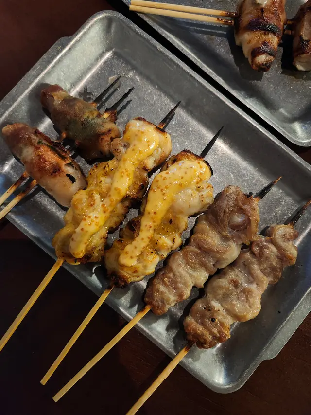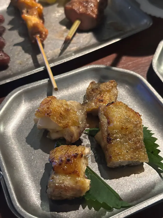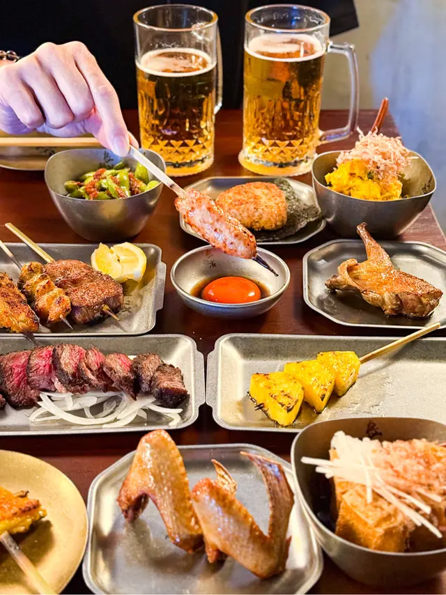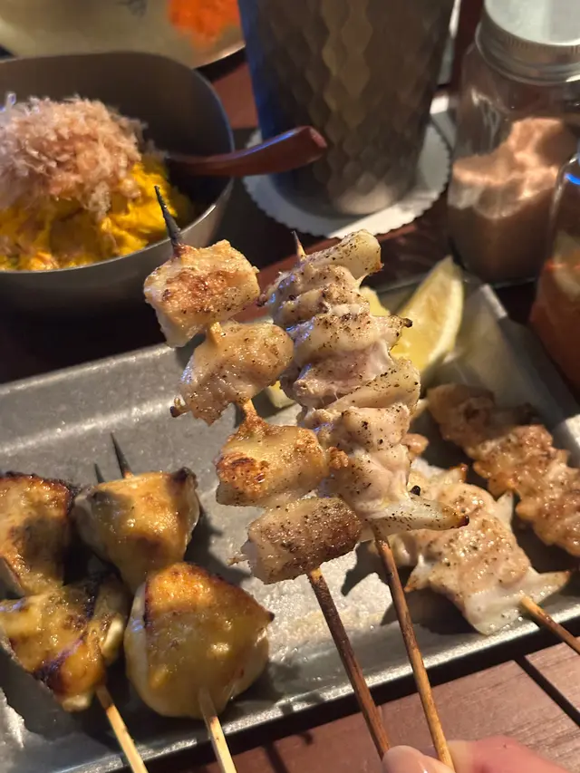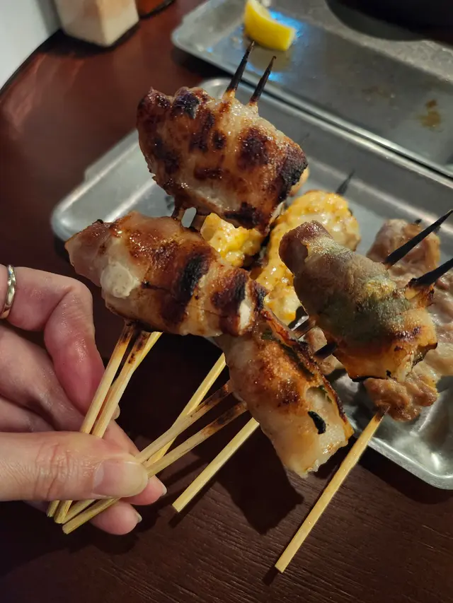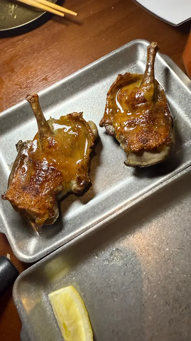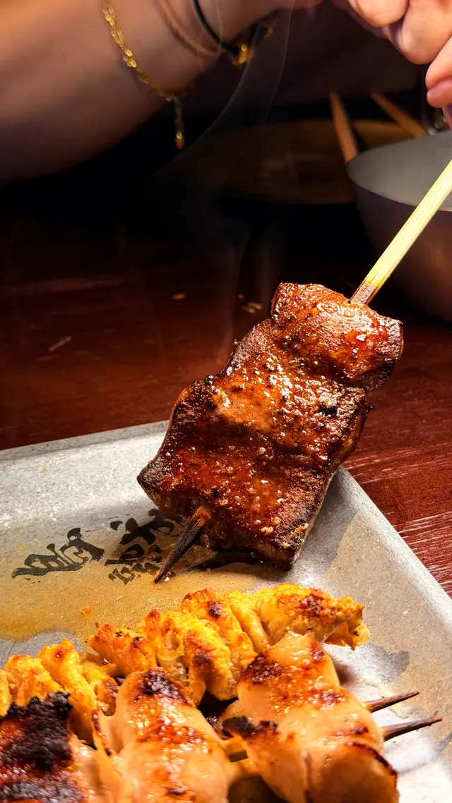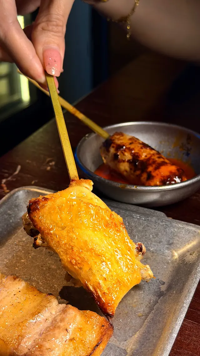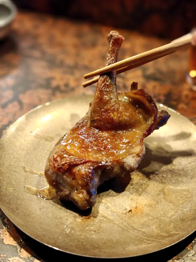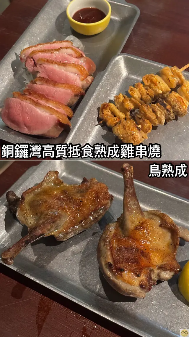 最近發現銅鑼灣有間隱世串燒新店,專玩乾式熟成技術,仲要係全港首間自設熟成櫃嘅燒鳥店!用本地三黃雞同日本土雞,裝修走日式居酒屋風格,昏黃燈光加吧檯位,可以睇住師傅即燒,氣氛幾chill~最正係晚市有免費鴿翼送,未點菜已經有得食!今次試咗幾款招牌熟成串燒,「熟成特上鴿皇胸腿肉」真係一試難忘!乳鴿經過48小時熟成,肉質粉嫩多汁,外皮燒到脆卜卜,鴿味濃到似食緊迷你版燒鵝,絕對係全場MVP!「三黃雞腿肉」分前後腿四件,雞皮香脆肉質嫩滑,店員教路後腿要包紫蘇葉食,果然清新解膩~「自家製月見免治雞肉棒」沾滿蛋黃同醬油,口感豐富,係完美嘅comfort food!其他串燒都各有特色,「明太子翠肉瓜」明太子鹹香配多汁翠肉瓜,平衡得剛好;「本地活豬玻璃肉」肥瘦均勻,燒到脂肪透明如玻璃,入口即化!主食「特濃花膠雞白湯烏冬」超抵食,湯底熬足12小時,奶白色濃郁到黏嘴唇,花膠份量唔孤寒~飲品推薦「桔仔薄荷鴨屎香茶」,清新解膩,同串燒出奇地夾!整體嚟講,串燒火候控制得好好,熟成技術真係令肉質提升不少,價錢合理(仲有Sapporo買一送一!)。但缺點係稀有部位有時賣晒,旺場服務稍忙亂。聽聞老闆之前喺Nadagogo學藝,質素有保證。…查看更多