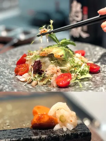沙律是牛油果帶子沙律慢煮三黃雞湯雞翼串牛橫隔膜串雞軟骨串