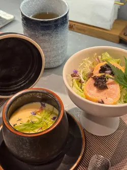 🍶中環 | 鳥駅 | 燒鳥解剖圖鑑 🍣🅰️ 三黃雞雞湯烏冬 💯不是串燒不好,而是雞湯太驚艷!! 是日MVP, 黃金膠質爆棚,三黃雞熬十小時的濃湯掛滿稻庭烏冬,吸溜時黏住嘴唇的幸福感🐔 🥗前業季節沙律 :牛油果, 車厘茄,生菜蓋上粉櫻透光的雞肉刺身,蘸自家製日式油醋汁,酸味刺激醒胃🍅 山葵長芋:長芋條爽脆,配上山葵辛香竄,好refreshing 🔥 燒鳥五重奏 雞甲狀腺:薄鹽輕燒鎖住半熔岩質感,咬破脆膜味道濃郁。大蔥雞腿肉;腿肉縫隙嵌滿炭香,蔥段帶甜,經典組合。雞翼:刷了醬油燒成琥珀焦殼,外脆肉嫩🍗 雞胸軟骨 :聽覺系美食,軟骨在齒間蹦跳如跳跳糖。雞心:爆汁! 果然係一隻雞只得一粒既雞心,肉味濃郁。串燒安格斯牛小排:油花四溢,wasabi融化在肉紋間,辛嗆與脂香合而為一的美味。白鱔:燒烤鎖住膠質,魚皮香脆,魚肉彈牙多汁。 豬肋條:豬油香惡感×幸福感的表現蘑菇,蘆筍:爆汁,健康又好食。明太子燒飯團:鍋巴控至愛,日本米捏成三角後炭燒,焦脆米粒鑲滿爆籽明太子醬,海苔包著吃鹹鮮脆香。 🍨 甜點終章 豆腐雪糕:雪葩的口感,濃郁口腐味。焦糖大福:麻糬煙韌,配雪糕又幾夾。 …查看更多