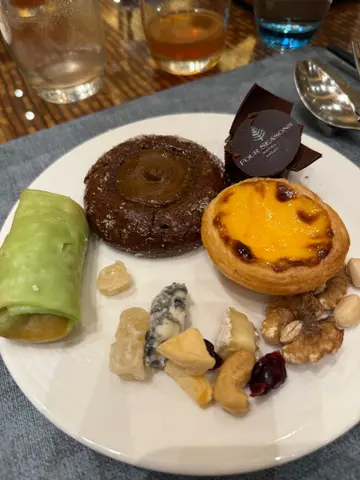 8年後再臨澳門,家族於澳門四季酒店住一晚,順道於鳴詩食自助晚餐。由門口開始有服務員介紹餐區,專責我地一行6人的服務員Eden,為我們送上是日signature 🍷每個員工皆笑容滿臉,善意主動打招呼,先生取了兒時回憶魷魚乾、炸雲吞,仲有即燒豬肉乾,非常美味,Eden主動介紹地道用芥末點魷魚乾,風味再添層次,贊