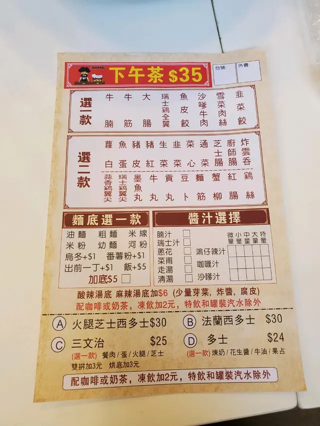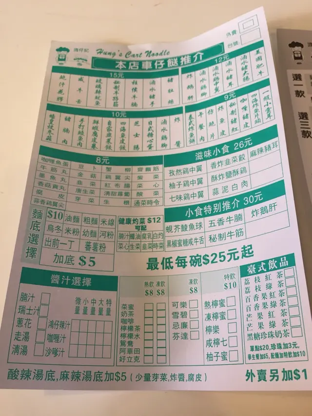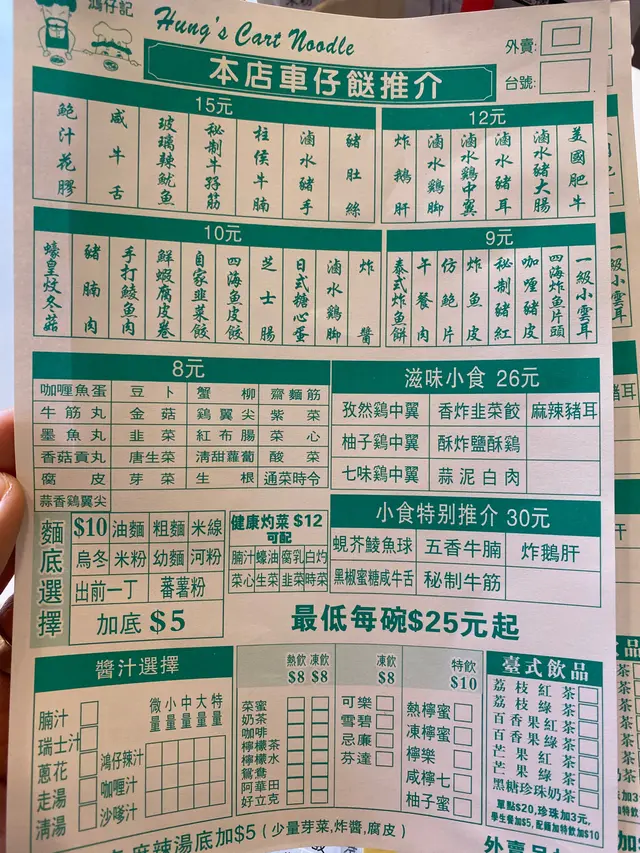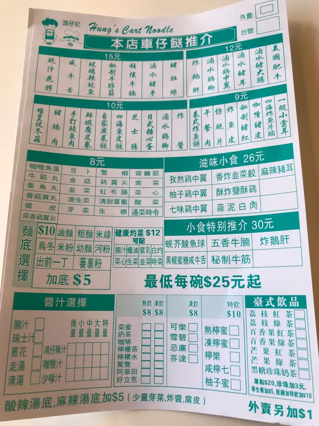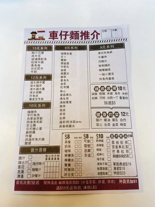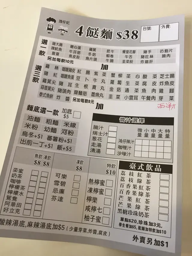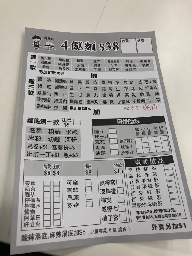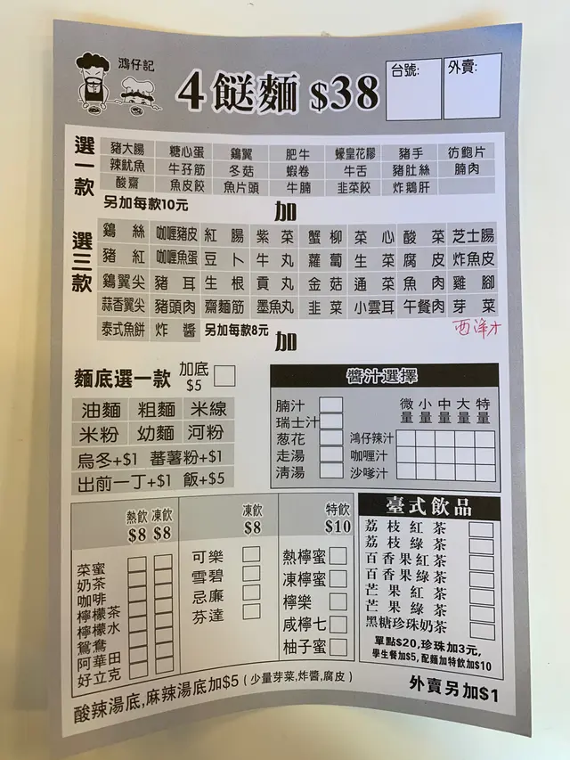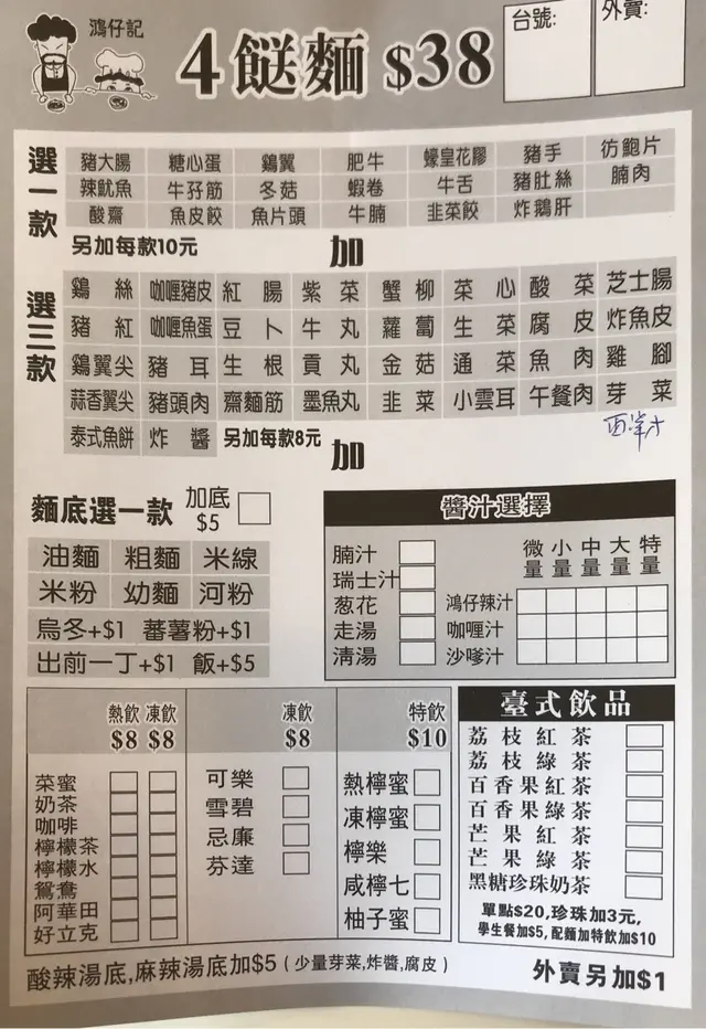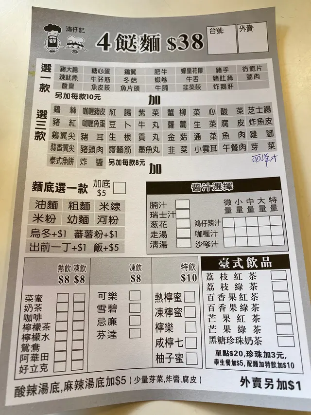 尼依到食4餸車仔麵真係超抵。4餸車仔麵(蠔皇花膠、炸醬、蟹柳、午餐肉、葱花、特量鴻仔辣汁、紅薯粉),蠔皇花膠,煙韌有咬口,無炆到腍曬、爛曬,炆得幾入味;炸醬,調味唔會太重口味,味道幾清爽;蟹柳、午餐肉,份量都算多,味道中規中矩;特量鴻仔辣汁,味道唔算好辣,不過都夠惹味;紅薯粉,口感煙韌、幾掛汁。5餸車仔麵(冬菇、酸齋、泰式魚餅、咖喱魚蛋、蘿蔔、大量鴻仔辣汁、烏冬),冬菇,炆得好腍,而且好大嚿;酸齋,味道酸甜、好開胃;泰式魚餅,摻和左D香料喺入面,味道好特別,魚香味濃;咖喱魚蛋,口感彈牙,咖喱味唔算太辣;蘿蔔,口感實中帶腍,味道清甜;大量鴻仔辣汁,鴻仔記獨有醬汁,必叫吖;烏冬,口感Q彈。鹽酥雞,炸粉、雞肉比例恰當,新鮮炸起好有肉汁,有孜然粉調味,整體幾香口。黑糖珍珠奶茶2杯,即係黑糖珍珠配港式奶茶,珍珠嘅黑糖味道濃郁,口感煙韌;奶茶茶底香濃,口感幼滑。查看更多