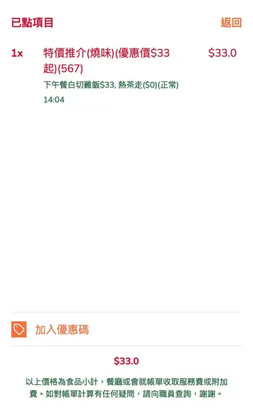 本來是被門口的名單吸引入來,但坐下之後拿到的卻是另外的東西,但本着入都入了,就試試看。結果感覺超伏。根本就是迷你叉燒飯,卻沒有加迷你兩個字。大小可以看圖二中與紙巾的真實對比。味道方便的評價:叉燒有筋,味道不均,口感中下。配菜是冷盤,一條冰冷的青菜。白飯水氣太重,你可以想像外賣飯盒存放很久之後被水蒸氣加濕的白飯。凍咖啡味道正常。環境方面:卡位比較狹窄,如果你直接起身會傷到大髀。環境衛生方面合格,筷子和匙羹沒有污漬,但就是顯得比較細小,單純拍照沒有其他對比的話很具有欺騙性。服務方面:坐落沒有水提供,需要自取。有個戴眼鏡的大媽應了你之後沒有過來下單。之後叫了另外一位。看見有餐廳Wi-Fi,但需要密碼,見不到有提供。QR code下單,但我收不到訊號