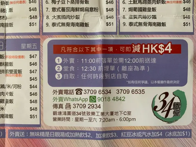 鴻圖34 (觀塘) 網址: https://s.openrice.com/QrbS0G7W700 地址: 香港觀塘鴻圖道34號致樂工業大廈地下C號舖 電話: +852 37096534