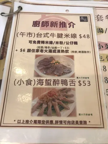 鹵家鴨 $68鹵水味唔算好濃 岩岩好 鴨既份量都多 有10幾舊海蜇醉鴨舌 $68 醉鴨舌都真係第一次食酒香味聞落幾濃 食落還可以鴨舌入味 多肉食老火湯係必點無味精猴頭菇南北杏椰子蜜棗紅蘿蔔粟米豬骨湯 個名好長 證明落左好多料去煲似住家煲既湯水…查看更多