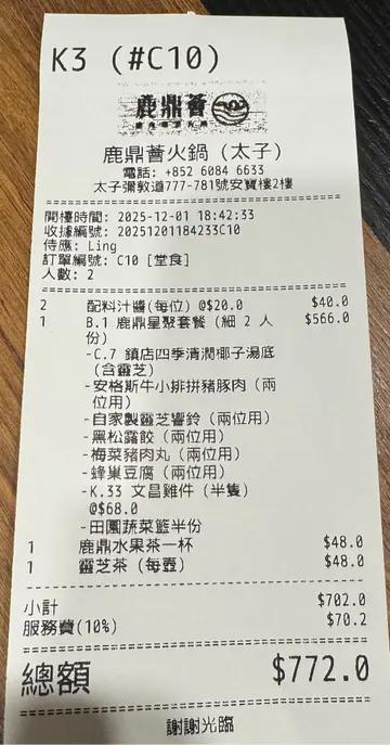 尋晚喺太子附近行街,見到呢間新開靈芝主題火鍋店,趁個溫度仲涼涼地,一於快快手打多次邊爐。餐廳座位做到好似每枱有個包廂空間咁,基本上唔會見到其他枱的客人。招牌靈芝四季清潤椰子雞湯底 (含靈芝及清遠雞半隻)$208湯底好足料,有齊靈芝片、馬蹄、竹蔗茅根、椰子肉等嘅材料,店員建議我地落食物之前要試一試個湯底,個湯底果然好清甜,而且入喉非常舒服,好有清潤感覺。跟埋個湯底有半隻清遠雞,半隻雞份量唔少,而且肉多唔肥,肉質嫰滑有彈性,食落冇雪味。西班牙黑毛豬片 $138有8大塊黑毛豬片,食落肉質細嫩且富有彈性,帶有濃郁豬肉原味而冇豬騷味。自家靈芝響鈴 $68唔知係咪因為響鈴面舖滿靈芝粉嘅關係,呢度嘅響鈴味道多個層次,食到淡淡藥材味。本地牛肉丸(8粒)$88呢度牛肉丸唔係平時食到口感較扎實嗰種,而係有啲似飲茶食到蒸牛肉球嗰種質感,所以肉質會再嫰滑啲。靈芝海中蝦滑 $98蝦滑都有加入靈芝粉,同埋除左食到彈牙口感外,仲可以食到有一粒粒新鮮蝦肉。菠菜苗 $48有機玉米 $38呢度蔬菜類食物都好新鮮,食落好鮮甜,可以中和整餐火鍋肉食嘅油膩。瑰荔堂煌 $108(買一送一)我地一入枱,店員就拎左兩杯呢款雞尾酒welcom drink俾我地試飲,店員介紹嗰陣講係話用左靈芝白酒去調配,而呢杯雞尾杯確實係非常容易入口,因為係加左橙汁同蜜桃糖漿關係,好啱女仔飲,加埋有買一送一優惠,我地最後都再order左兩杯。另外想讚一讚呢度嘅服務做得好好,我地食左差不多一半時間左右,有店員突然主動提出話想落啲靈芝粉喺我地個湯底度,個作用係可以減少湯底入面嘅嘌呤,食打邊爐可以keep住健康啲,當然啱哂我地啦。…查看更多