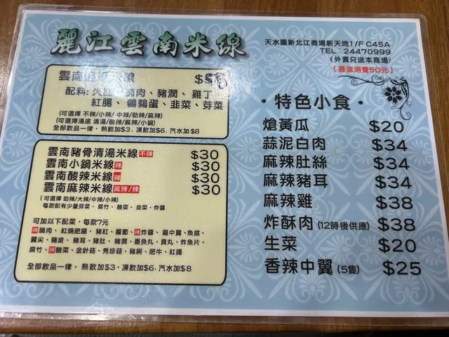 麗江雲南米線 (天水圍) 網址: https://s.openrice.com/QrbS0gPC000 地址: 香港天水圍天湖路1號嘉湖新北江商場一期1樓C45A號舖 電話: +852 24470999