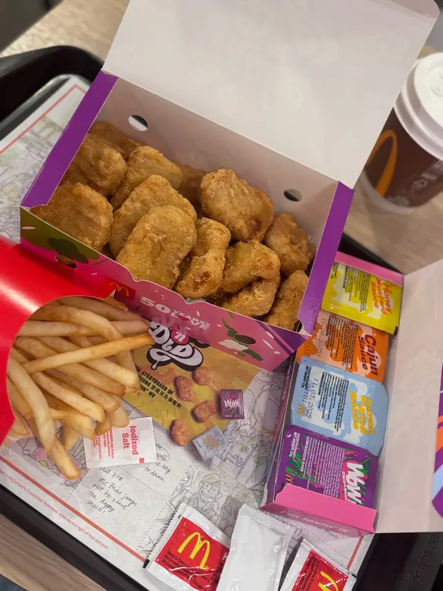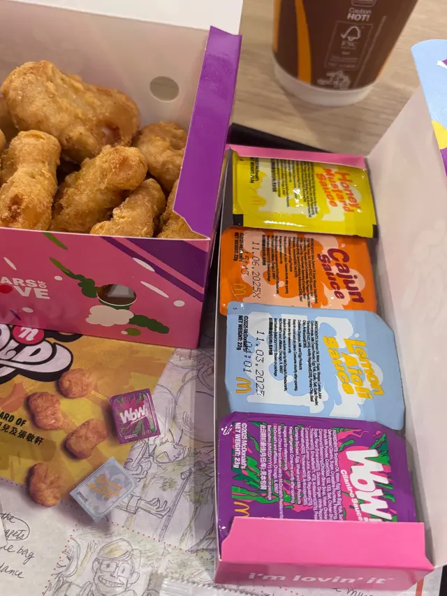 🍗 18件麥樂雞|外脆內嫩18件麥樂雞份量充足,炸至金黃酥脆,雞肉juicy多汁,鹽香適中,適合多人分享。😋外皮薄脆,內裡嫩滑,搭配新醬料更添風味,性價比高,惟油分稍重,建議即食以保口感。🌿 四款新式醬料|味蕾衝擊新醬料包括香草醬、蒜蓉醬、辣椒醬及蜜糖醋醬,各具特色。香草醬帶奶香微甜,與雞肉碰撞出奇異和諧,卻因過濃花香讓人意外;蒜蓉醬濃郁蒜香中混雜微酸,味道大膽新穎,初嚐時有衝擊感,後回甘可口。😲辣椒醬微嗆帶果香,平衡雞肉油膩;蜜糖醋醬酸甜清新,開胃解膩。四醬各有千秋,惟香草與蒜蓉組合較為怪誕,建議單獨享用以適應味蕾。🏙️ 環境與性價比麥當勞分店遍布全港,地點便利,適合快速用餐。📍HK$50的18件套餐加四醬,價格親民,份量足,性價比高。新醬料創意十足,香草與蒜蓉醬雖怪,但挑戰味蕾帶來新鮮感,適合愛嚐鮮者。麥當勞以限時套餐與新醬料,帶來視覺與味覺雙重享受查看更多