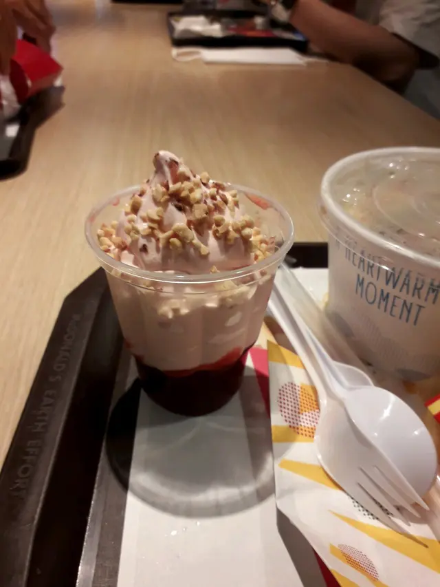「麥當勞」經歷由農曆新年之前,直到農曆新年「元宵」過後仍然有「招財福堡」超值套餐的漫長日子之後,「麥當勞」終於還是決定了,推出「後農曆新年」限定口味食品,名稱叫做「全日扭扭粉」。顧名思義,「麥當勞」把平日在早餐時段裡面的「扭扭粉」食品,變成全日二十四小時都有提供的食品,不過「全日扭扭粉」只限於短期內限定供應,「麥當勞」在新期間限定食品推出後立刻把「全日扭扭粉」下架了。今次「麥當勞」決定了在早餐以後,正餐價目表食品裡面,推出可選擇不同湯底的湯「通粉」類食品,已經象徵着現在的「麥當勞」,逐步走向「港式茶餐廳化」。所以網絡裡面不時都有網民提議「麥當勞」,和曾經幻想過「麥當勞」終有一日會推出港式「乾炒牛河」食品。現在「麥當勞」推出全日都有供應版本的「扭扭粉」,相信「乾炒牛河」登陸「麥當勞」的日子越來越近。平日「麥當勞」早餐時段裡面的「沙嗲我扭扭粉」,食客可以自由選擇原味的「雞湯」湯底,或者「豬骨」湯底。恰巧新蒲崗「越秀廣場」「麥當勞」店員亦有問我「沙嗲牛肉扭扭粉」想要什麽湯底。我選擇了享用「麥當勞」一般「雞湯」湯底的「沙嗲牛肉扭扭粉」超值套餐,「沙嗲牛肉扭扭粉」裡面已經有很多甜味粟米,所以我亦沒有必要把套餐炸薯條改為粟米,直接享用一般炸薯條就夠了。況且「麥當勞」全日「沙嗲牛肉扭扭粉」套餐的實際內容,不像「麥當勞」早餐時段超值套餐一樣提供「炸薯餅」,而是提供一般的炸薯條,所以加錢將「沙嗲牛肉扭扭粉」轉成「大大啖套餐」,轉變比早餐時間最大。例如「全日」版本「沙嗲牛肉扭扭粉」套餐追加變成「大大啖套餐」之後,除了有「大薯條」之外,還可以享用到「海鹽鮮檸梳打」,這是早餐時間享受不到的事。至於當時「麥當勞」裡面沒有為「全日扭扭粉」超值套餐,提供任何限定口味的薯條「Shake Shake粉」,所以我只是選擇味道比較甜的「美式香烤」口味「Shake Shake粉」了事。當然,如果要我在「和風紫菜」跟「美式香烤」兩款口味薯條「Shake Shake粉」裡面作個選擇的話,我還是比較喜歡味道比較甜的「美式香烤」薯條「Shake Shake粉」多一點。至於「麥當勞」「大大啖套餐」裡面的「海鹽鮮檸梳打」飲品,「海鹽鮮檸梳打」飲品裡面的甜味還是跟我以前,在其他分店「麥當勞」飲過的「海鹽鮮檸梳打」甜味味道,幾乎一模一樣。不過有一點可以肯定的是,我在「越秀廣場分店「麥當勞」裡面,在「海鹽鮮檸梳打」裡面喝不到明顯的海鹽鹹味,飲品裡面的檸檬酸味比較強烈。至於「越秀廣場」分店「麥當勞」廚房製作的「沙嗲牛肉扭扭粉」,「沙嗲牛肉扭扭粉」實際製成品裡面的切片鮮牛肉,牛肉份量比我以前在其他分店,早餐時間食到的「沙嗲牛肉扭扭粉」增加很多。而且「越秀廣場」分店「麥當勞」廚房製作「沙嗲牛肉扭扭粉」,還在「沙嗲牛肉扭扭粉」裡面,加入很多味道偏向鮮甜的辣味沙嗲醬醬汁,令「沙嗲牛肉扭扭粉」裡面的雞湯湯底味道變得更濃更甜。至於「沙嗲牛肉扭扭粉」裡面的牛肉,牛肉的口感也都算是偏嫩,而且牛肉裡面沒有筋,所以沙嗲牛肉總算是不難咀嚼,兼且牛肉能跟濃味沙嗲醬汁,一起被咀嚼和吞嚥下去。至於「沙嗲牛肉扭扭粉」裡面的「扭扭粉」,「扭扭粉」今次浸泡在雞湯湯底裡面不是很長時間,就已經被我很快食完了,所以「扭扭粉」仍然沒有被浸到變腍,仍然保留有實淨口感。食完整個「麥當勞」「沙嗲牛肉扭扭粉」套餐,包括甜味「美式香烤」口味「Shake Shake粉」炸薯條,跟甜酸味「海鹽鮮檸梳打」飲品之後,是時候享用在自助點餐機選擇了,增加額外草莓糖漿的「雙重草莓新地」。我曾經擔心「麥當勞」,若在草莓軟雪糕表面上淋草莓糖漿,偏熱的草莓糖漿可能會令「草莓新地」軟雪糕加速融化。結果「麥當勞」選擇把甜味的草莓糖漿放在軟雪糕新地底層,我立刻鬆了一口氣。因為「越秀廣場」分店「麥當勞」廚房把溫度偏熱的草莓糖漿,放在塑膠膠杯的底層,再等等草莓糖漿溫度短時間內稍為降低之後,才把冰凍的甜味草莓軟雪糕,慢慢逐點擠入膠杯裡面。所以甜味的草莓軟雪糕,在放進已經預先擠入甜味草莓糖漿的塑膠杯裡面之後,草莓軟雪糕沒有因為溫度偏暖的草莓糖漿而急速融化,仍然食到完整冰凍口感的甜味草莓軟雪糕。由於「麥當勞」「雙重草莓新地」是由「草莓」糖漿,到「草莓軟雪糕」本身都含有濃厚草莓甜味的軟雪糕新地甜品,所以整杯「雙重草莓新地」裡面的草莓甜味都能夠造到貫徹始終,還有香脆口感花生碎襯托作為結尾。難得「麥當勞」整杯「雙重草莓新地」,都沒有使用含可可成份的糖漿,令整杯「雙重草莓新地」都不含任何提神成份,令我食完後儘快坐專綫小巴返回西貢,回家洗澡刷牙後仍然能立刻上床睡覺。查看更多