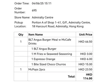 美國安格斯牛漢堡套餐($66.5)3分- 哩個漢堡肯定比平時的安格斯漢堡好味,裡面又有幾片脆煙肉,cheese亦比較好味,分量亦大。- 但比較Burger King 的漢堡,仍然系差D,包括味道,碳香,肉質。- 香港特色的橙味espresso咖啡,橙香味明顯吾夠,似變壞的橙汁味,espresso 亦明顯吾夠咖啡香,另外只有凍。Choco Churros(餐+$15)5分)- 好重朱古力味,皮好薄好鬆,Mcpops (2分)- 一個吾凍吾熱的甜品- 絕對吾流心- strawberry 味的流心比較好環境(2分)本來一間普通的麥當勞應該摟高D分,但以一間金鐘的旗艦店,就吾得。當然已經比其他麥當勞或者快餐店寬敞同舒服,但裝修感覺一般服務(1分)- 睇到真系請了好多年輕(大概20歲左右)的part time, 但幾個英文真系吾得,連問佢apps 上面Admiralty 系咪金鐘分店都吾知道。請記住哩度系金鐘旗艦店啊!- 只掃檯面的QR code 系吾得,一定要download apps,咁遊客咪好麻煩。- apps 系503座位系用吾到,行到收銀附近至可以,network好失敗,個男waiter都系咁解析。- 送餐上來漏左比 - 凍飲飲管 - 薯條番茄汁 - 其實都聽到waitress系度解析比另一檯客送錯餐。- 外賣位置一格格,但都要派一個人幫忙,比較中國每間都有數碼箱自取餐,香港真系好落後- 唯一比較好系抹檯好快好乾淨。…查看更多