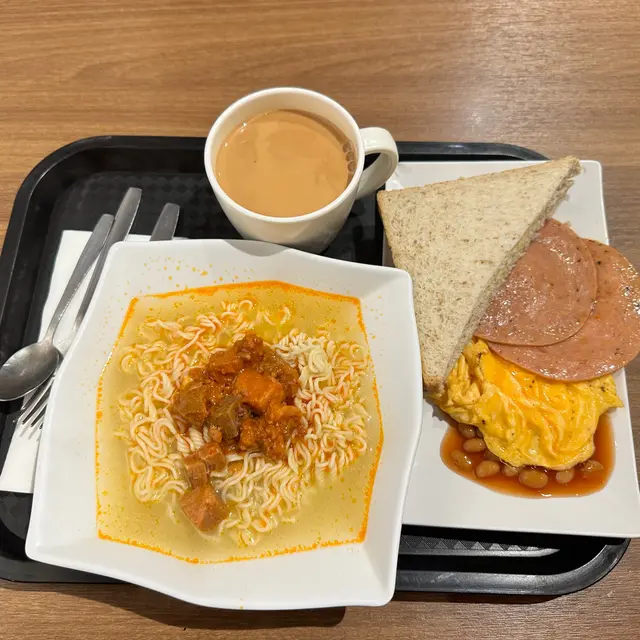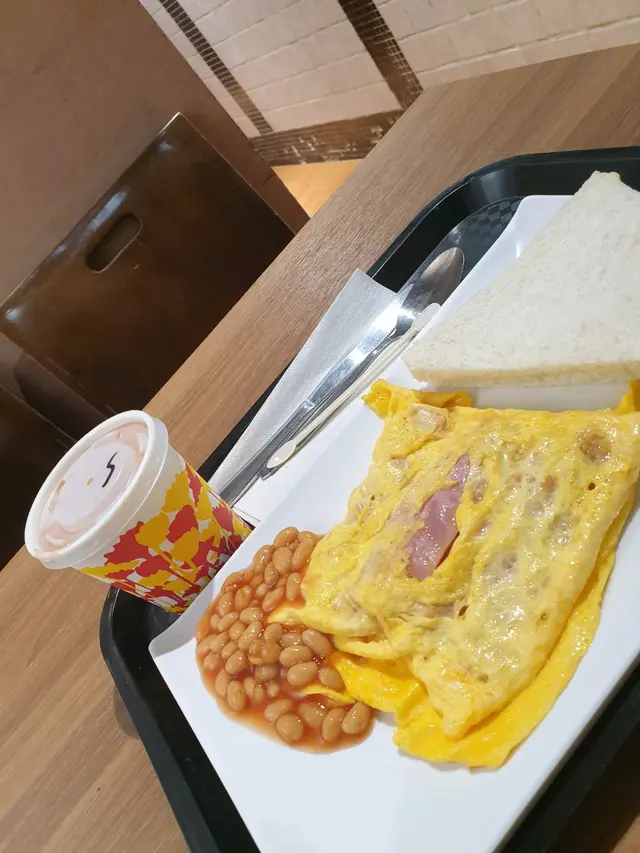火腿奄列 + 焗豆 + 方包 + 熱奶茶