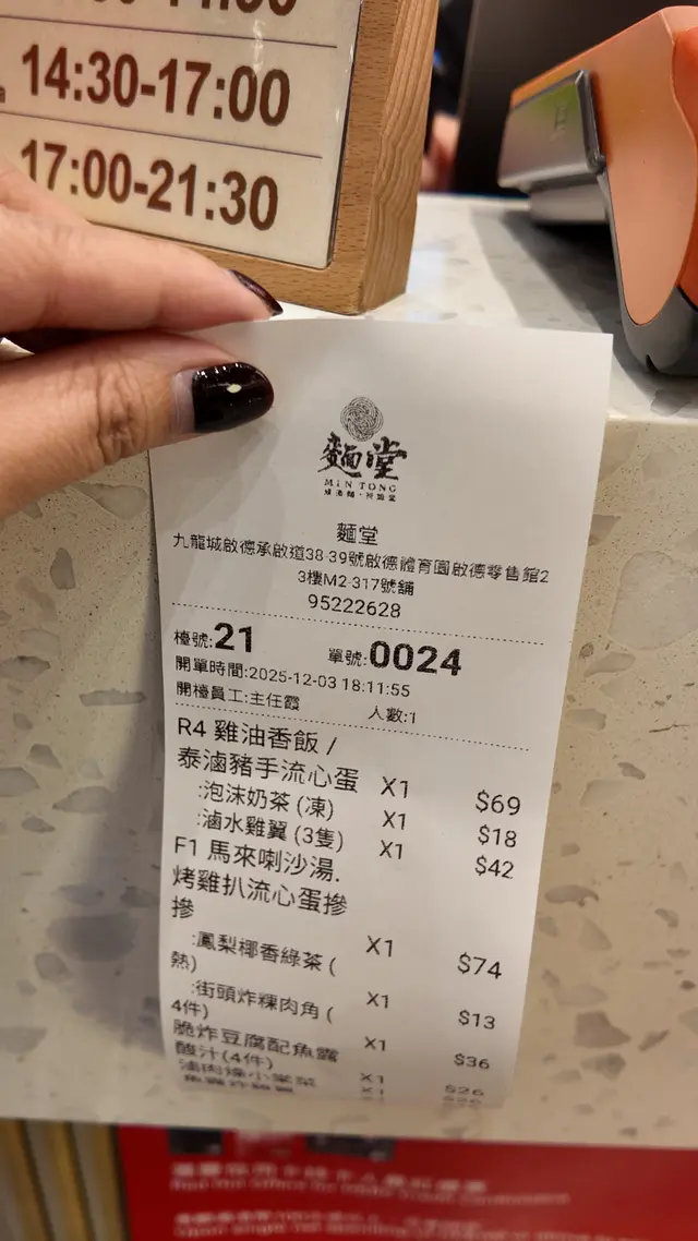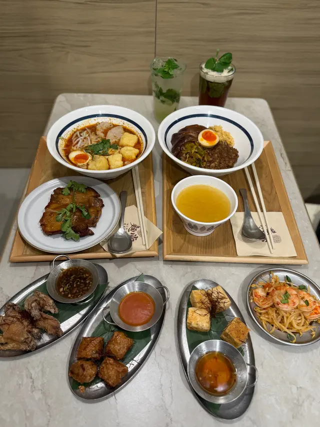 麵堂是一間位於啟德體育園啟德零售館的星馬泰主題麵店,餐廳裝修簡潔,燈光明亮。主打東南亞特色湯麵同手作拌麵。馬來喇沙湯虎蝦流心蛋摻摻:湯底帶有微辣,椰香味十足,辣度適中非常順口。配料豐富包括新鮮虎蝦、青口、豆卜、爽脆芽菜和軟滑的流心蛋,蛋黃帶有濃郁醬油味,豆卜吸湯,整體味道層次豐富。清雞湯香茅豬扒鮮河粉:豬扒煎至外層微焦帶脆,肉質鬆化有肉汁香茅香氣濃郁且滲透豬肉之中,鹹香惹味。清雞湯底清甜,河粉滑嫩。白咖啀香茅豬扒飯:豬扒外脆內嫩,肉汁飽滿,香茅味道明顯,為豬扒增添獨特香氣,白咖喱汁帶有椰漿的淡淡甜香及微辣,香料豐富。青檸鮮薄荷梳打:青檸味道酸中帶甜,新鮮薄荷葉帶來涼爽清涼感,梳打水的氣泡使飲品有刺激感,更添解渴。鳳梨清新特調味道帶有酸甜、清爽且果香濃郁,加入氣泡梳打,帶來清新且不會太甜膩的口感。炸雞脾即叫即炸,外皮金黃香脆,內裡雞肉juicy。娘惹大蝦:蝦肉鮮嫩且帶有甜味,配芽菜蝦增加口感層次。脆炸豆腐配魚露配酸汁:豆腐外皮炸得非常脆,內裡柔軟。搭配酸汁,增添鮮味兼開胃。…查看更多