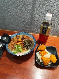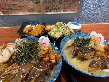 經過見到間麵店裝修好特別 同Friend齊齊試下先~麵麵俱到麵全食🍜好特別啊 係壽喜燒湯底!超豐富 有蝦、豬軟骨同埋好多其他配料~鍾意食壽喜燒一定鍾意😋仲加咗20蚊多咗炸雞 好食!豚骨拉麵🍜依舊有三塊大大塊豬軟骨!加12蚊升級沙律同埋烏龍茶 好抵~轉咗烏冬 好味啊!成間鋪頭裝修非常日式小店嘅感覺 午餐時間坐滿晒人 真係好受歡迎👏好彩早小少到 如果唔係都冇位坐 不過枱下面有掛鉤可以掛袋 都比較方便 大家一齊坐密D都好溫馨~
