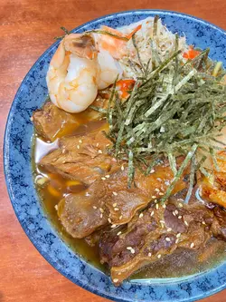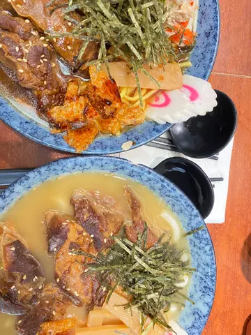 喺條巷仔入面 本身都搵咗陣非常之細間舖頭 全部都係bar枱Menu選擇唔多 不過都吸引主要有三種湯揀 可以任意配搭麵麵俱到麵全食 ($88)呢個最吸引咩都有牛肋條、豚軟骨、豬皮脆脆、虎蝦蟹肉、鳴門卷、味付筍片、蔥花紫菜絲、芝麻、炸乾蔥基本上就係佢所有麵嘅配料都有啱晒咩都想試嘅人😁牛肋條同豬軟骨都好入味同埋好腍虎蝦都幾爽 蟹肉就唔算好多存在感唔大揀咗味噌鮮蝦湯 唔辣 都幾香蝦味未算好濃 濃稠到啱啱好同埋傳統手工蛋麵 份量超多同個湯底同埋啲餸都幾夾😋日式濃汁燴牛肋條壽喜燒湯 ($72)呢個揀咗烏冬 烏冬偏腍 唔煙靭壽喜燒湯甜甜地咁都OK牛肋條一樣都係好腍好易入口👍🏻不過相比之下全食就一定性價比高啲😎