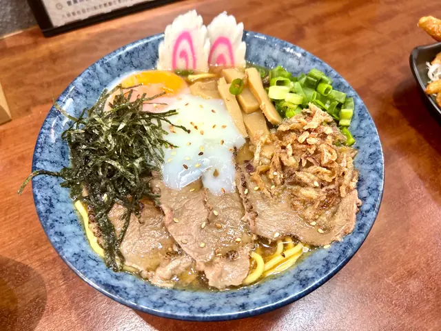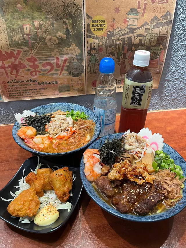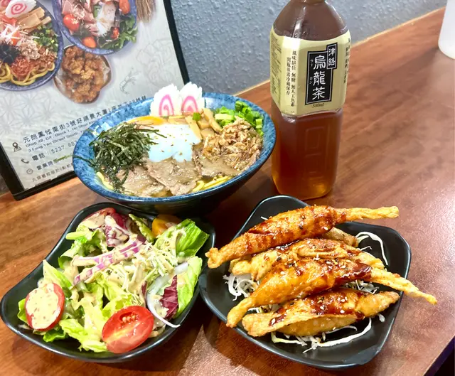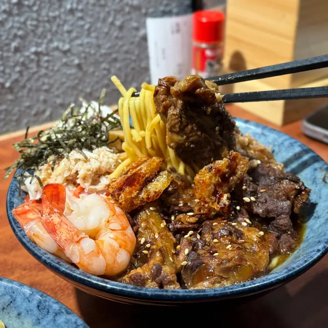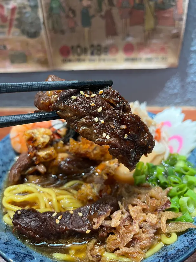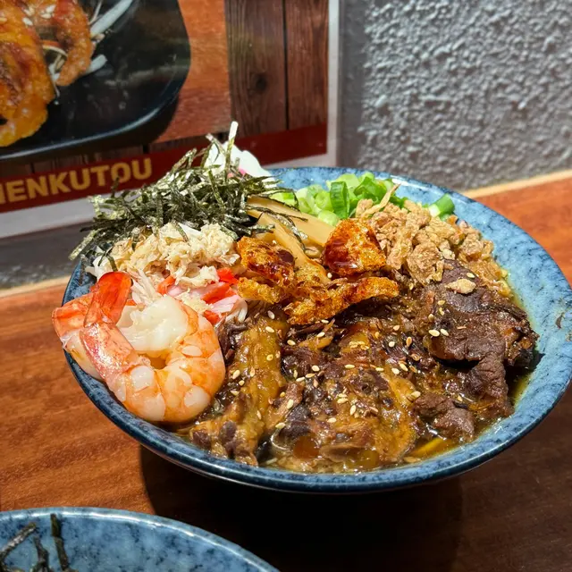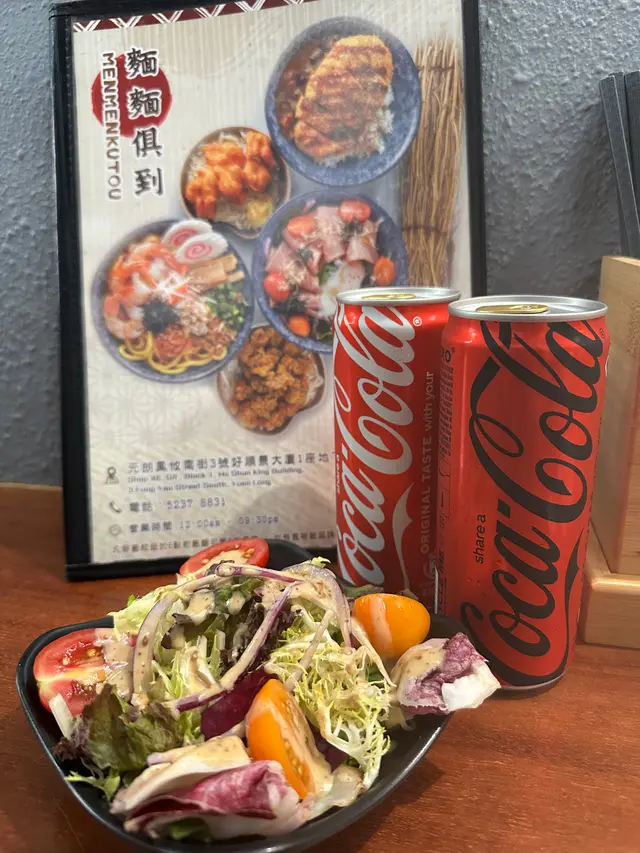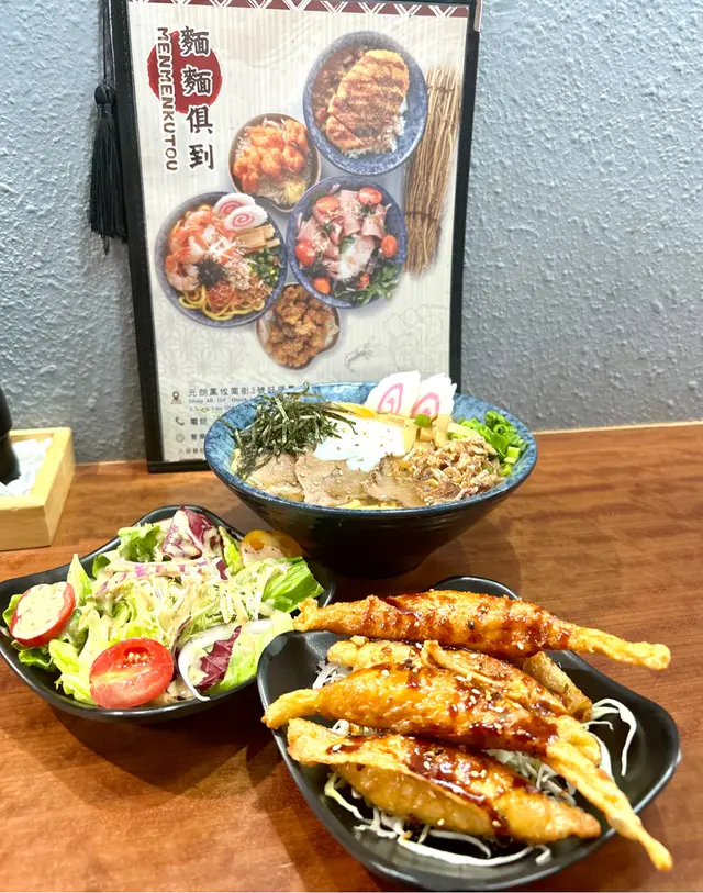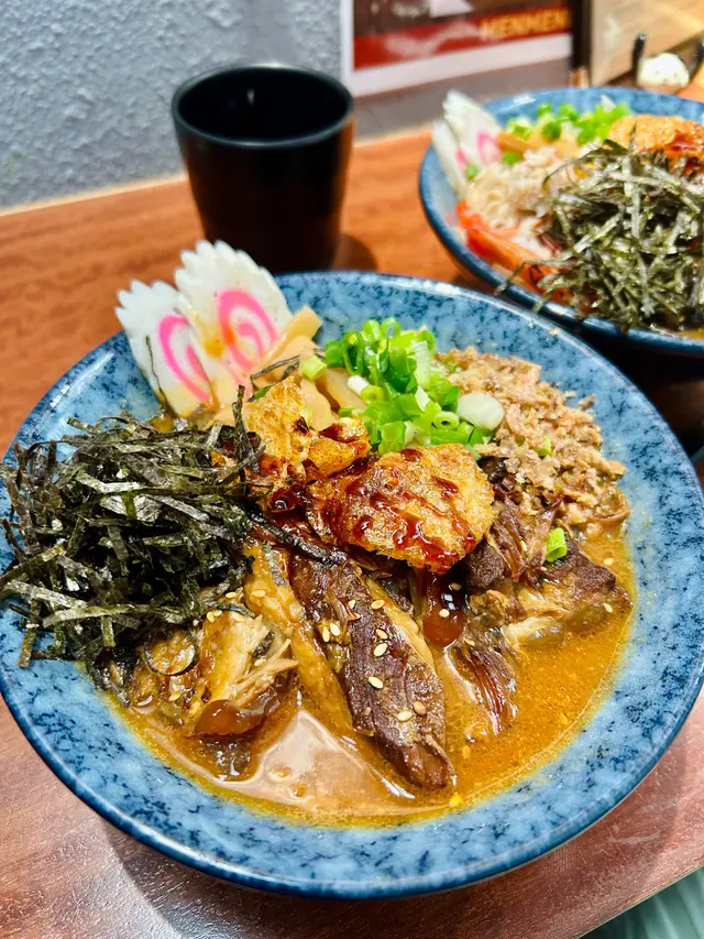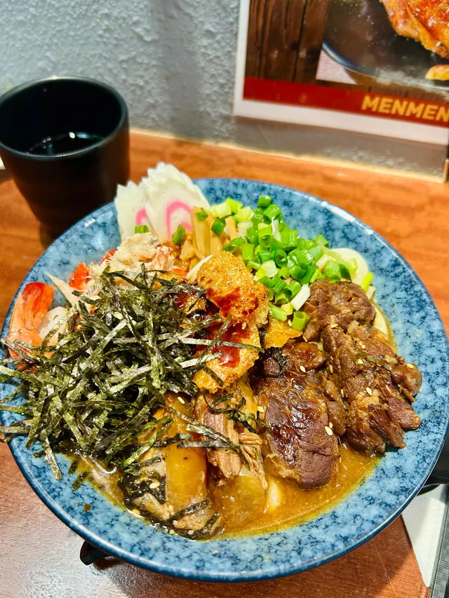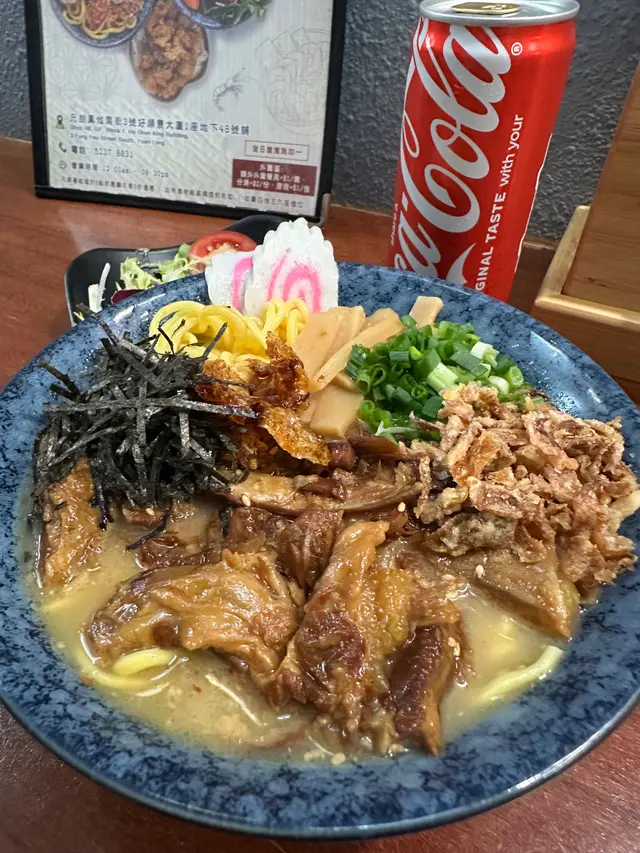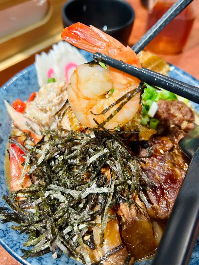 壽喜燒湯麵湯底甜鹹平衡牛肋條軟嫩 豚軟骨juicy豬皮脆脆添口感 虎蝦蟹肉鮮甜鳴門卷彈牙 筍片清香麵條吸滿湯汁✨熱辣辣好正另外+$20跟餐嘅唐揚炸雞酥脆飲品仲有氣泡檸檬茶成個份量足 充滿豐富嘅滿足感蟹肉海老鮮蝦味噌湯麵有虎蝦 蟹肉 鳴門卷 味付筍片 蔥花 紫菜絲 芝麻 炸乾蔥跟餐+$12有可樂同沙律