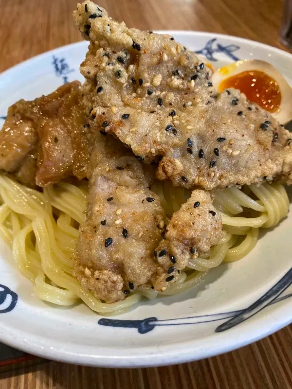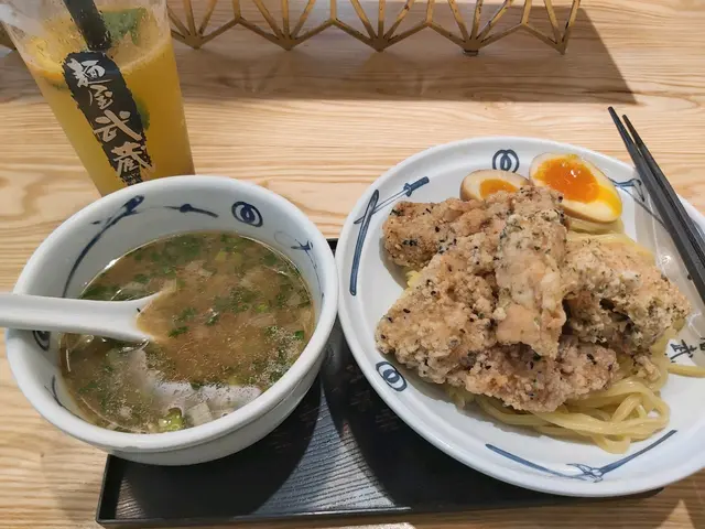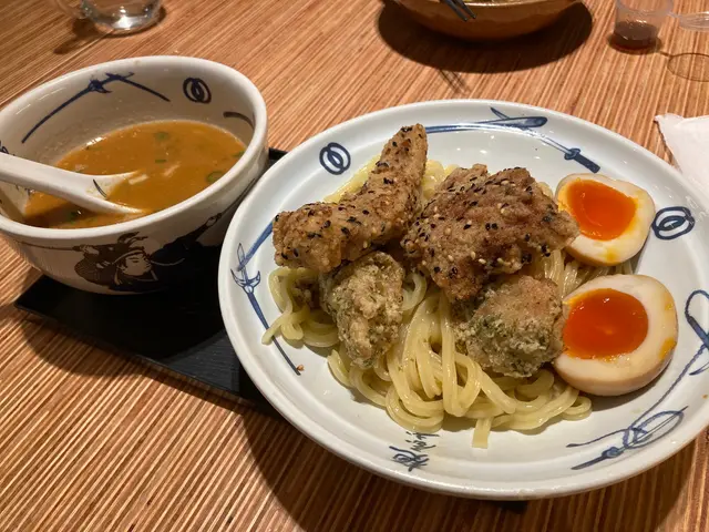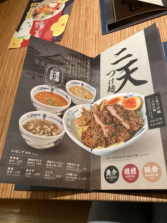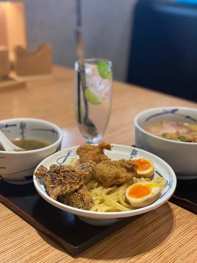 閒時食個新午餐,都會黎二手食個拉麵,平日午餐仲跟埋飲品,價錢都合理。二天炸雞豬扒拉麵 $75有齊炸雞同炸豬扒,試晒兩樣,炸物脆脆地,炸皮唔算厚,不過浸左湯淋晒了。浸底係豚骨湯,清清地,唔太濃。拉麵唔算硬。個人就鍾意重口味同硬麵多啲。反而溏心蛋有驚喜,半熟都入味。ok!二天沾麵 $78都係相當嘅配搭,炸物無沾過湯明顯香脆左,好味左。沾汁味道更濃,揀左魚介湯都食得出魚介味。麵條係粗身,都幾掛湯。沾麵明顯好食啲。當然比唔上出面嘅拉麵名店,味道算正正常常,貪佢近近地,平平地。…查看更多