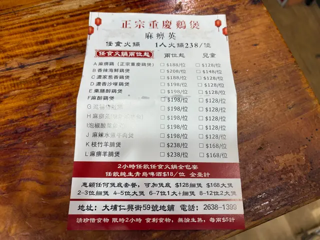 麻痺英 (大埔) 網址: https://s.openrice.com/QrbS0xO4900 地址: 香港大埔仁興街59號地舖 電話: +852 26381399