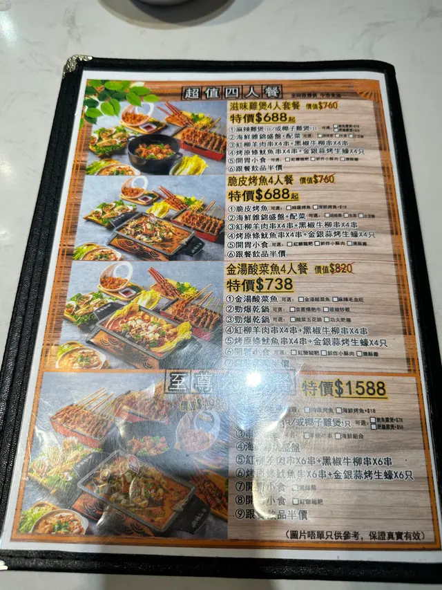 秋風起,係時候要去打下邊爐,今次要介紹荃灣廣場隔離既「麻辣年華」, 佢哋有個二人餐好抵食,$498有烤魚同埋海鮮邊爐,份量亦都十分足量,以下就係套餐包括既野:烤魚套餐$498(青藤椒)至尊海鮮烤魚呢盤至尊海鮮烤魚份量真係唔講得笑,條魚係煎過,外皮有少少脆,而湯底揀咗青藤椒味,有少少麻同辣,呢頭岩岩食完條魚就發現仲有好多餸未搞掂,分別有:基圍蝦、魷魚、蜆肉、鮑魚;仲有啲配菜:紫洋蔥、芽菜、芫茜同檸檬,另外仲有一盤火鍋配料有菜、蝦、金針菇、鮑魚同埋冬菇,食完都已經十成飽。不過呢個套餐話明大份量,當然仲有其他野:4串羊牛肉+2隻蒜蓉生蠔;呢四串燒得好好味,外脆內軟,唔會燒得乾身,食落好惹味,羊肉唔羶,牛肉又軟熟,仲有兩隻蒜蓉十足既大生蠔,又大隻又鮮甜!最後飲返杯跟餐+ HK$24 超大杯既至尊水果茶!十分足料,同出面飲品舖既重量杯差不多。呢一餐十分滿足!值得再黎。查看更多
