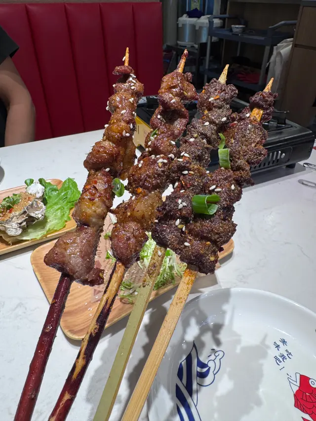 朋友帶我黎第一次試呢間餐廳當時已經係夜晚9點 店員態度好好 安排我哋三人坐張闊落啲嘅枱☺️平時好少食串燒 因為覺得要食好多先飽我地3個人叫咗個🔹串燒組合套餐🔹包括勁爆乾鍋、串燒組合、開胃小食各一款我哋揀咗京蔥爆肥牛、串燒45串同紅糖糍粑😋另外仲叫咗燒茄子、烤年糕、烤秋刀魚✨—————————————————————-🔹京蔥爆肥牛微辣唔會好辣 幾有鑊氣同惹味🔹45串串燒包括有魚蛋、粟米、豬頸肉、雞軟骨、滋滋腸等🔹串串鍋揀咗蕃茄湯,味道幾好,唔會太濃🔹紅糖糍粑熱辣辣,好似麻薯咁幾煙韌查看更多