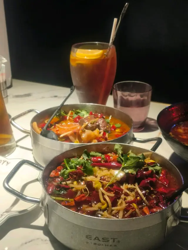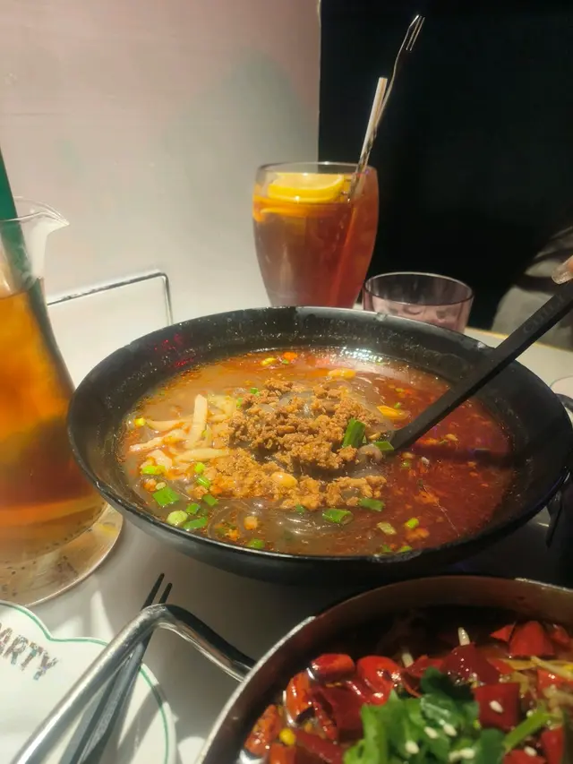 銅鑼灣Shopping後去補充體力!🌶️麻辣派對的Lunch set選擇好多~ 款款都好吸引啊!2個人點了2個set 🥘🌶️麻辣水煮牛 & 毛血旺2款川味菜式🥢滿滿嘅辣椒真係好有食慾啊!🍜辣度有四個層次,第一次食點了小辣,味道正宗。🥩麻辣水煮牛 牛肉片分量好多食極都有肉質嫩滑多汁搭配芽菜香辣浓郁湯底 好惹味啊!🥘毛血旺 裡面一樣香辣開胃 裡面有魷魚🦑 百葉 鴨血 🥓厚切午餐肉 配搭十分豐富!🍜招牌酸辣水晶粉酸辣湯底好開胃,水晶粉口感煙韌 好過癮啊!最後 居然仲送糖水啊(濃濃綠豆沙)店內佈置都好特色啊!✨有種夜上海feel~~ 色彩搭配 好特色啊!氛圍非常舒適,坐得幾舒服,慢慢食都得啊!!查看更多
