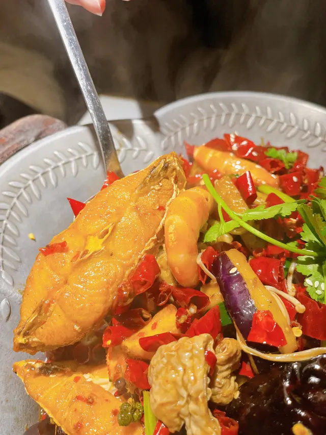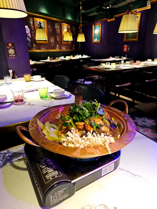 好少見烤魚地方咁有情調,環境充滿古典味,天花掛滿一個個彩色繡花球,印象特別深刻!六點鐘時間尚早 ,客人唔多可以慢慢影下相😬銅盤烤石斑魚 ( 紅燒蒜香味)原身配料實在太豐富!!有芽菜、萵筍 、金菇 、布豆腐 、魔芋、水晶粉等配菜!鍋底本身都有水晶粉但我地決定額外加一份水晶粉,煙煙韌韌好正🤭 布豆腐係我預料之外會有嘅配菜,記憶中有三件定四件,大件又厚身,裡面係蜂巢狀,完全吸收晒湯汁🤩蒜香味濃郁程度適中,加上我地叫走辣,味道唔會過濃或者過淡,食完唔覺得頸渴,個人最怕愈食愈咸的汁底,呢個口味挺適合我哋!原條石班魚炸過令魚皮部份食起來酥脆香口👍👍肉質軟綿綿且彈牙,基本上只有少少細骨,但食時依然要小心咀嚼!除咗烤魚同水煮魚之外,留意到餐牌上仲有好多唔同種類野食,海鮮糸列有蟹 、大小龍蝦、 蟶子 ,有幾款唔同煮法選擇,就算唔想大魚大肉都有米線、酸辣粉或者家常小炒…。查看更多