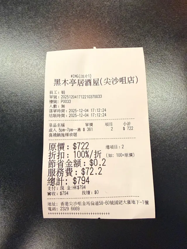 黑木亭居酒屋 (金馬倫道) (尖沙咀) 網上訂座即賺Rice Dollars 網址: https://s.openrice.com/QrbS0yme5W0 地址: 香港尖沙咀金馬倫道58-60號國鈀大廈地舖至1樓 電話: +852 23296669