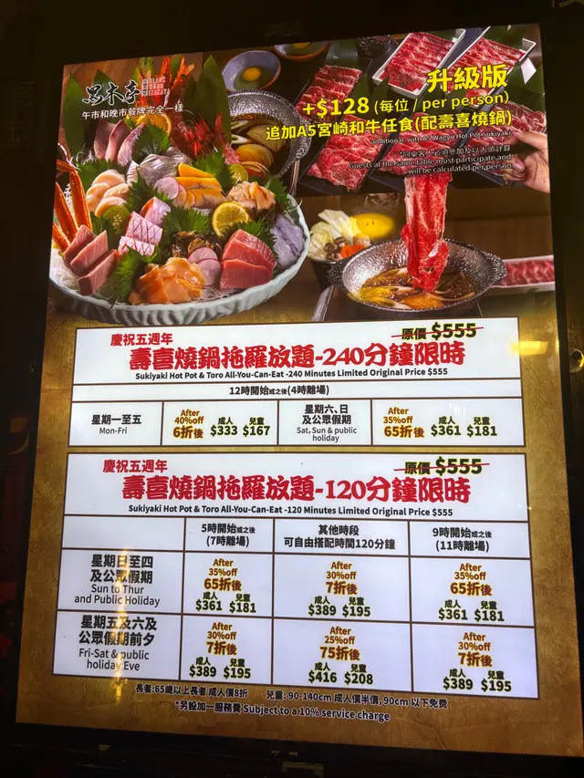 今晚超餓,喺金馬倫道搵咗一間日本居酒屋食放題。以前都有去過此餐廳是單點的,樣樣嘢都好好食。最近轉左提供香港人超愛食的拖羅及A5和牛放題。當然要再食過。仲要星期一至五9:00pm 後入座,65折 $361,食盡120分鐘。呢排成日聽人講尖沙咀黑木亭居酒屋個「A5宮崎和牛拖羅放題」有幾正,專登約埋班朋友去試下。食完之後果然冇失望,真心覺得性價比超高,絕對係會encore之選!我特別推薦個A5宮崎和牛壽喜燒,牛肉輕輕一淖,入口即溶,牛味香濃,湯底又甜絲絲,我同朋友都不知不覺encore咗幾轉。另外,拖羅同馬糞海膽都係回本必點,拖羅肥美鮮甜,海膽味道濃厚,一啲都唔吝嗇。仲有串燒、日本小食、海鮮桶等。除咗呢幾樣主角,其他食物選擇都好多。我個人幾鍾意個蒜蓉燒鮮蠔同鮑汁花膠海參,蠔夠大隻,花膠煮得入味。串燒即叫即燒,好似燒香草羊鞍都唔錯。自助區,除咗有前菜、沙律、熟食之外,最驚喜係有Häagen-Dazs雪糕任舀,食完熱氣嘢食返個雪糕就最完美。飲品方面,有成30幾款清酒、梅酒、紅白酒同汽水、自家茶任飲。我今次係晚市放題,有足4個鐘任食,時間非常充裕,可以慢慢食慢慢傾,唔使趕頭趕命。總括來講,黑木亭呢個放題無論係食材質素、種類定係環境時間都令人滿意 晚市9pm 後$333位(星期一至五)就可以歎到A5和牛、拖羅、海膽同任飲酒水,仲有香港人最愛的馬來西亞D24榴槤,真心抵食。…查看更多