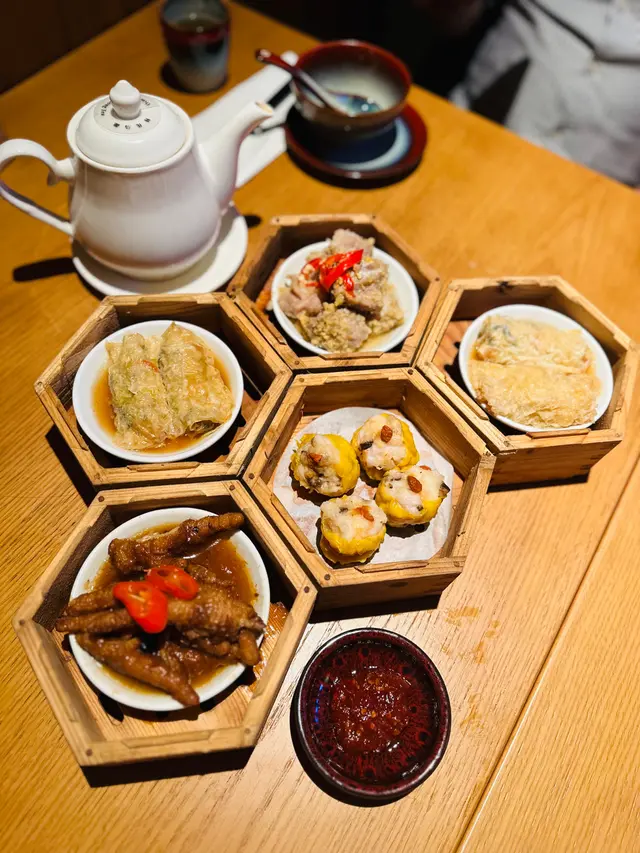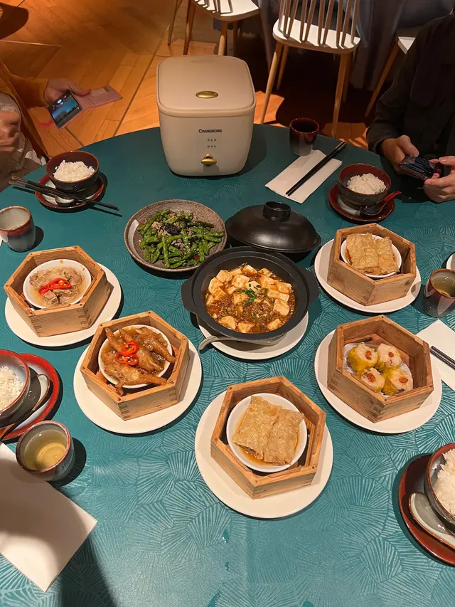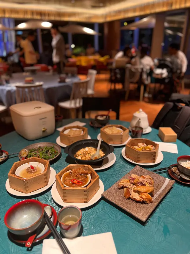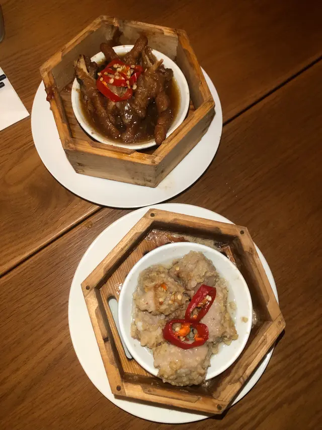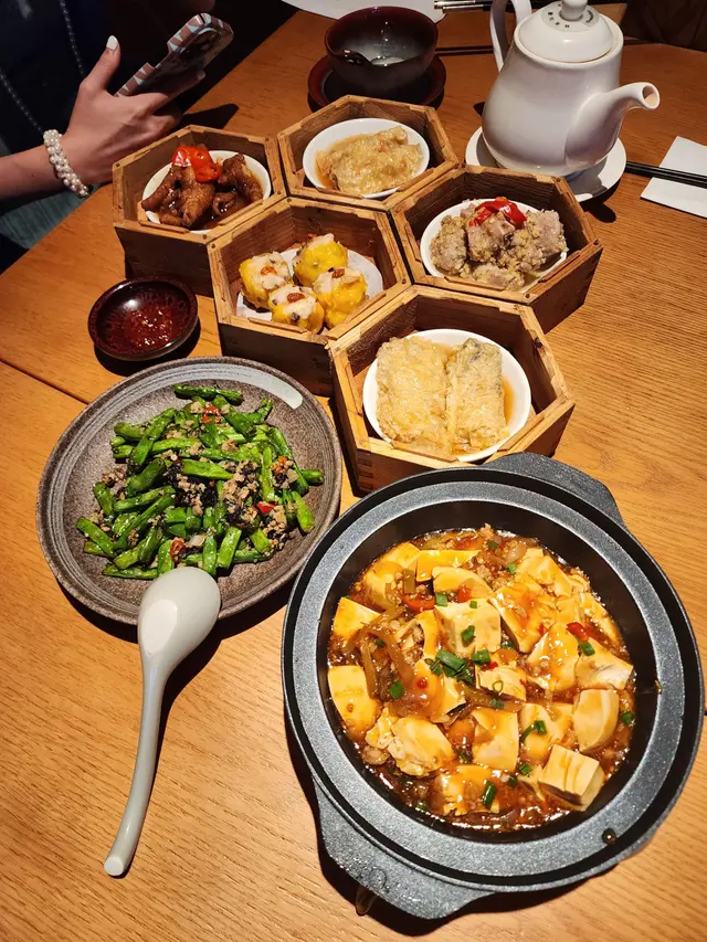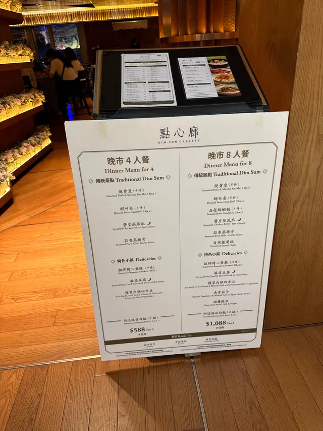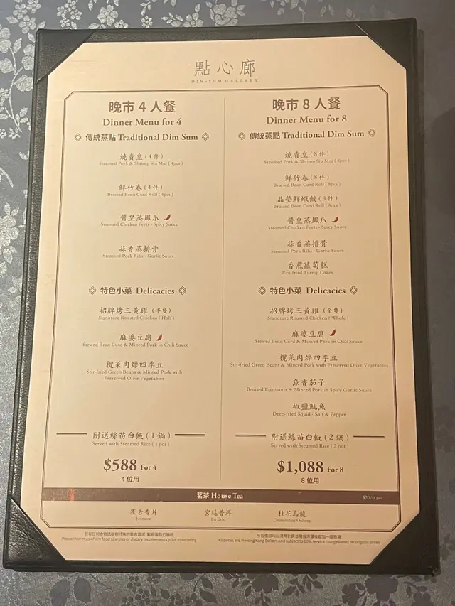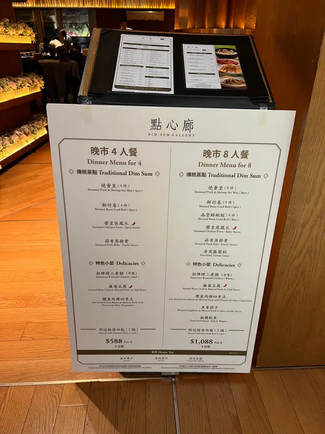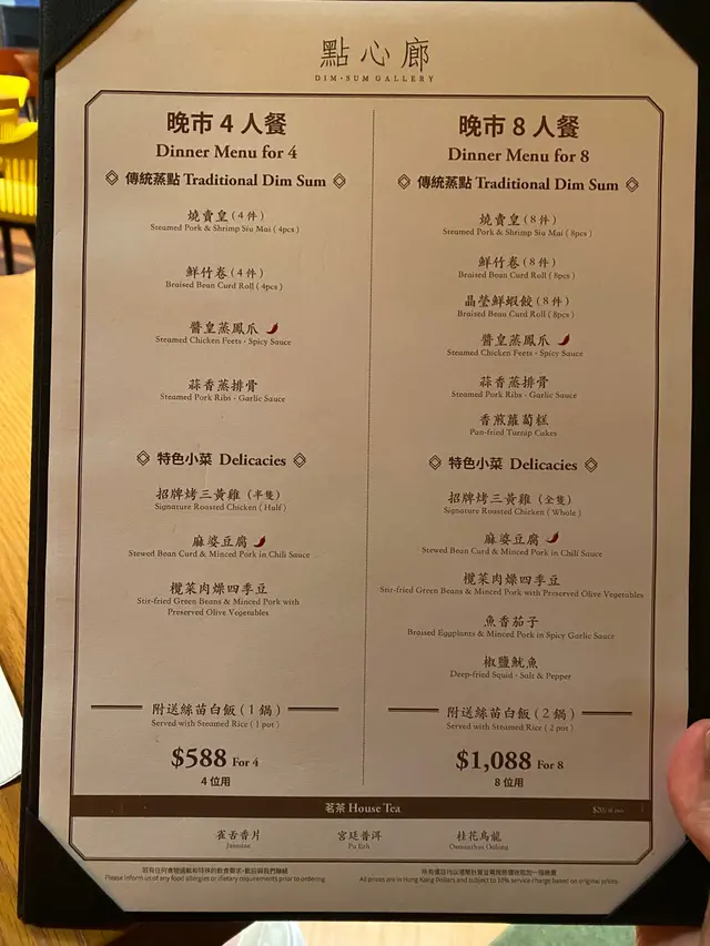 移左民既朋友難得返左黎香港,我地就去左山頂都行下,經過呢間中餐廳,發現有四人餐,而且價錢唔貴,好抵食。呢度用QR code 落單,好方便。我地4個人,點呢個晚市4人餐就岩岩好。套餐包括傳統點心同埋特色小菜。,點心方面,有燒賣皇、鮮竹卷、醬皇蒸鳳爪同埋蒜香蒸排骨。燒賣大大粒,鳳爪幾入味,水準好高。小菜方面,有招牌烤三黃雞、麻婆豆腐同埋欖菜肉燥四季豆。我最鍾意佢嘅燒三黃雞,皮脆肉嫩,啲肉超juicy。仲有成個電飯煲咁多既白飯,啱晒我呢個飯桶。…查看更多