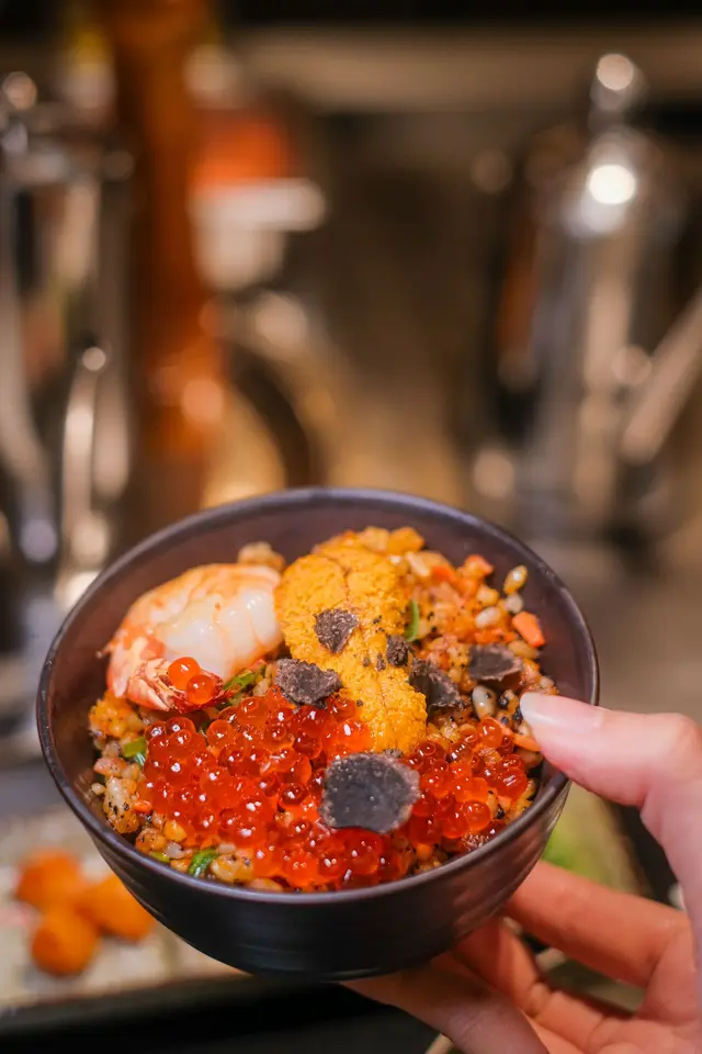 黑松露海鮮炒飯米飯粒粒分明,黑松露的香氣讓炒飯更加升華,海鮮的鮮味增添了豐富的層次感。