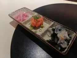 晚上來到了中環的龍亭吃晚餐。😁我們點了一杯甘濃梅酒(300ml),酒香四溢,酸甜適中。😄高級廚師發辦套餐(十一品)套餐的設計非常精緻,讓我們能夠品嚐到多樣的美食。😆招牌沙律裡面有煙三文魚包住的生菜,色澤鮮豔,口感清新。煙三文魚的煙燻味道與生菜的清脆相得益彰,讓人一口接一口,十分開胃。☺前菜漬物的酸酸味道讓人感到十分開胃。😄刺身我選擇了時令魚子醬生蠔,生蠔新鮮滑嫩,魚子醬的鹹香更是提升了整體風味。